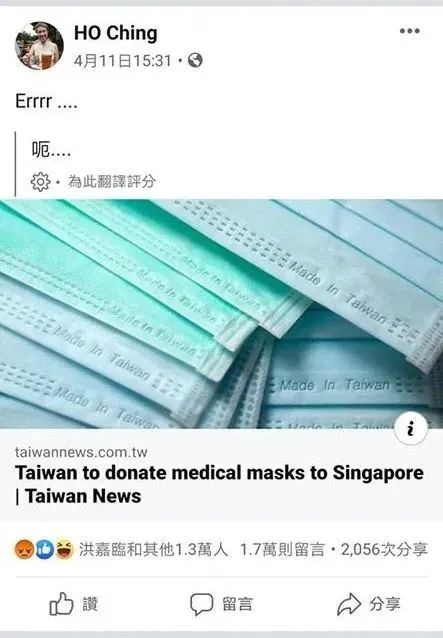 而在今年4月11日,在台湾媒体自称台湾向新加坡捐赠大量口罩后,何晶则在facebook评论了一句“errr(呃)”,疑似在讽刺台湾当局今年1月曾禁止岛内的口罩出口,导致新加坡的新科工程公司(ST Engg)在台湾2个口罩生产线无法运输口罩回新加坡一事。