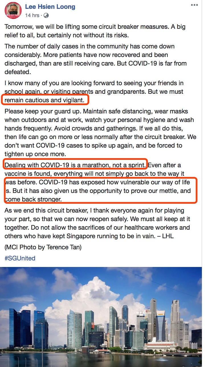 华人网编辑 • • 12593 次浏览李显龙总理昨天(6月1日)在Facebook提醒大家要继续保持警惕,并形容与冠状病毒的抗争如同跑一场马拉松,而非一场冲刺赛。“冠状病毒揭示了我们的生活方式有多脆弱,但也给予我们机会证明我们的能耐,以更强的姿态回归。”