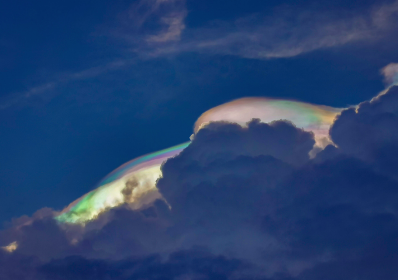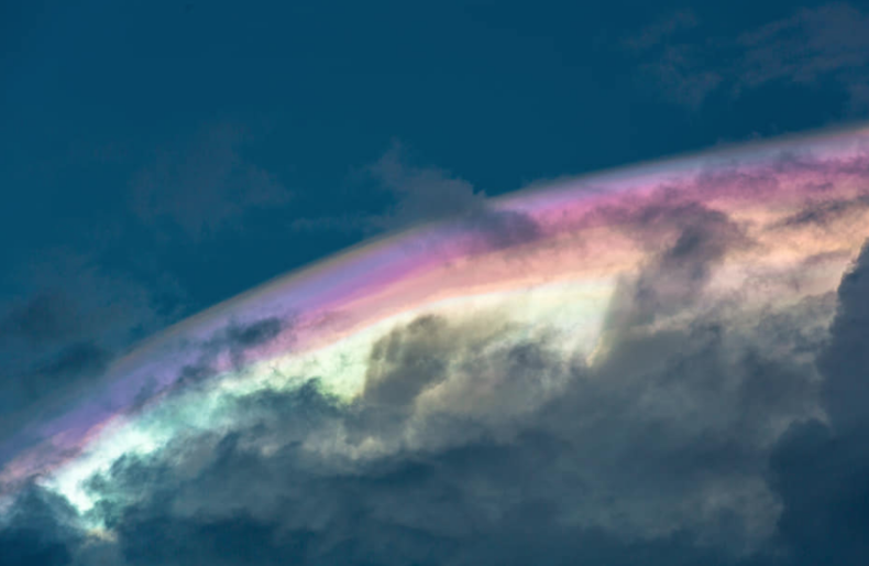 当微小的冰晶或水滴衍射(弯曲)光时,会发现这些虹彩云,从而在云中产生彩虹般的效果。这些通常出现在高积云,卷积云和柱状云之后。