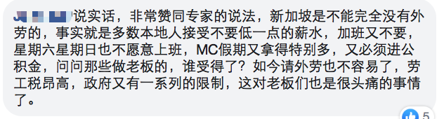说实话,非常赞同专家的说法,新加坡是不能完全没有外劳的,事实就是多数本地人接受不要低一点的薪水,加班又不要,星期六星期日也不愿意上班,MC假期又拿得特别多,又必须进公积金,问问那些做老板的,谁受得了?如今请外劳也不容易了,劳工税昂高,政府又有一系列的限制,这对老板们也是很头痛的事情了。