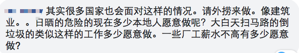 其实很多国家也会面对这样的情况。请外劳来做。像建筑业。。日晒的危险的现在多少本地人愿意做呢?大白天扫马路的倒垃圾的类似这样的工作多少愿意做。一些厂工薪水不高有多少愿意做?