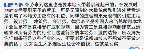 外劳来到这里也是要本地人带着训练起来的,在发展时期确实需要到更多的劳工,可是无限制的大量依赖和引进外劳肯定是剥屑了本地劳工应有的利益,同样的道理如果无限制的引进工程师,设计师 ,建筑师,会计师,律师甚至是外国人来当总裁那本地毕业生是不是直接受打压和影响,因为劳工是直接影响到建筑业运输业和所有劳力的行业让这些行业的本地劳工没的选择,所以拜托你们如果不是这些行业的人,不要老是说新加坡人不想做不要做之类的话 ,比如医生太多连医生也会不值钱,这就是现实