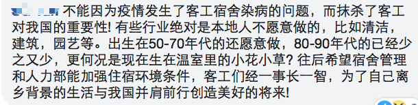 不能因为疫情发生了客工宿舍染病的问题,而抹杀了客工对新加坡的重要性! 有些行业绝对是本地人不愿意做的,比如清洁,建筑,园艺等。出生在50-70年代的还愿意做,80-90年代的已经少之又少,更何况是现在生在温室里的小花小草? 往后希望宿舍管理和人力部能加强住宿环境条件,客工们经一事长一智,为了自己离乡背景的生活与新加坡并肩前行创造美好的将来!