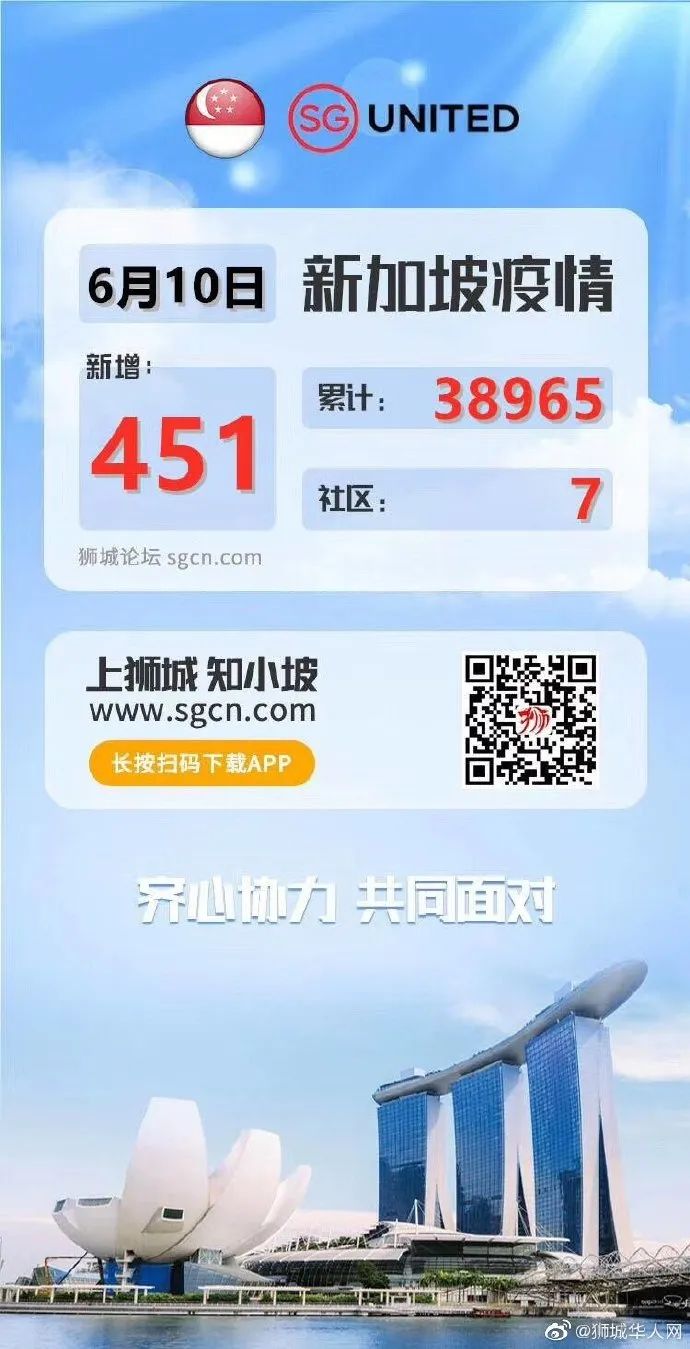 华人网编辑 • • 12399 次浏览卫生部初步统计,截至今天(6月10日)中午,新加坡新增451起冠病病例,是六天来最高,总病例达3万8965起。新病例当中多数是住在宿舍的客工,社区病例则有七起,当中三起是新加坡公民和永久居民,以及四起工作证件持有者。卫生部将在今晚发文告公布更多详情。