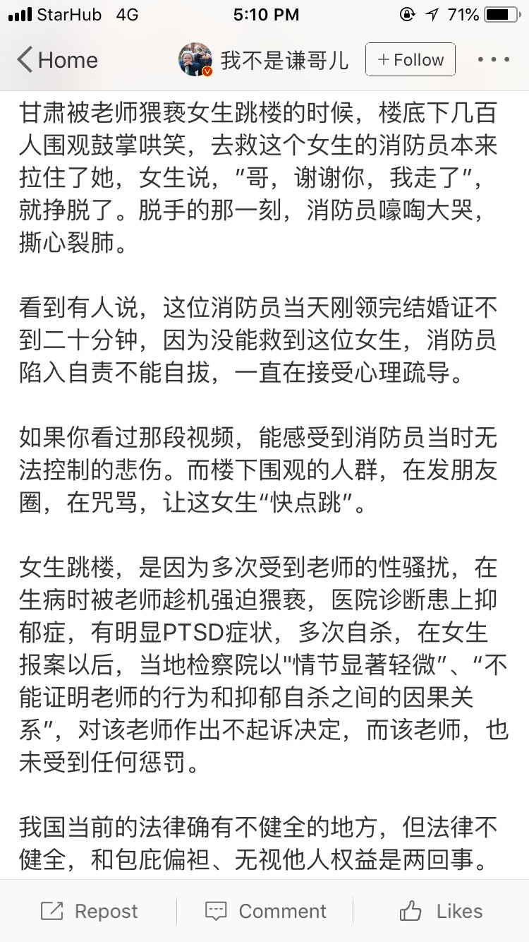 有没有人看到那个甘肃女生跳楼的新闻太难受了。很想爆粗,很想做点什么。怎么才能减少这样的悲剧