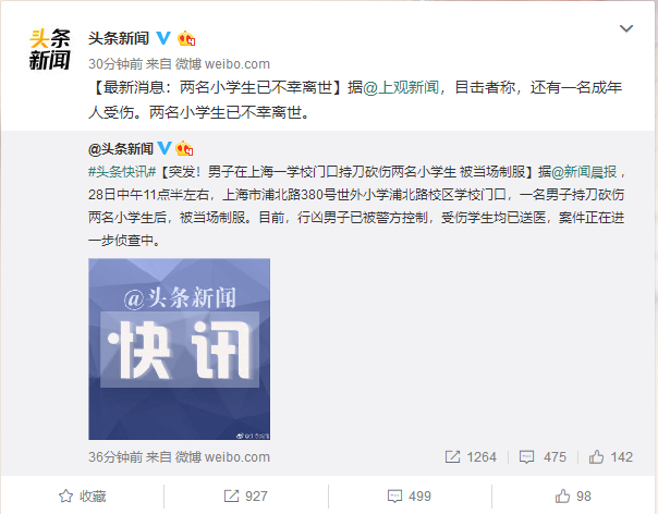 突发!男子在上海以学校门口持刀杀害两名小学生 被当场制服