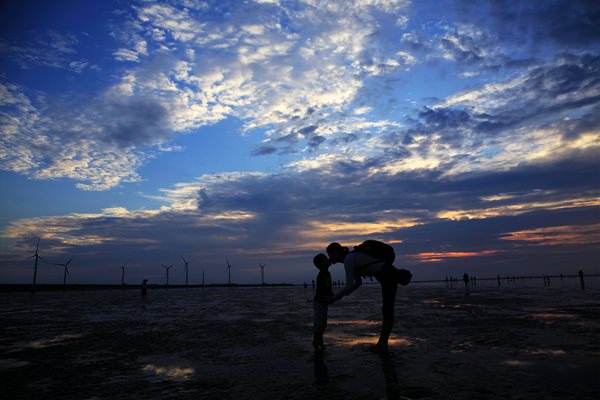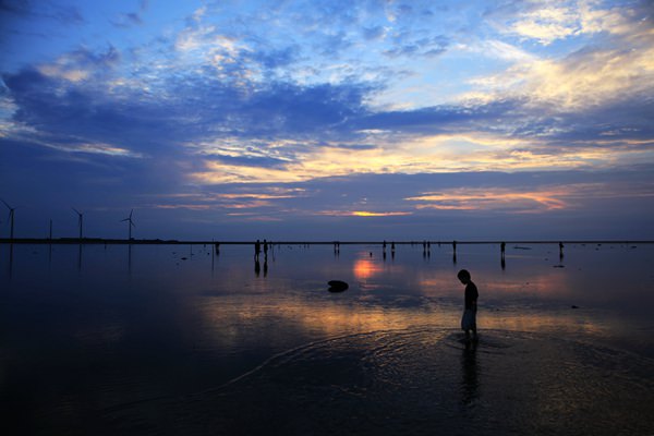 高美湿地是一片开阔的浅水湿地, 一眼望不到边,从城市里面到了高美湿地, 让人感到特别的心旷神怡, 心情舒爽。 靠近岸边长者一大片一大片的水生植物, 里面栖息着各种各样的小动物。 在高美湿地下水,水是浅浅的,水也很干净,可以走出去很远很远,还有小螃蟹小鱼跑来跑去。今天是多云的天气,看不到一轮红日落下彩霞映满天空的样子,但是天空中薄云的白色,厚云的黑色,云间天空的紫蓝色,太阳在云背后露出的红色,组成了色彩缤纷的天空,再加上水面如镜子般映下的倒影辉映,也是很美的。