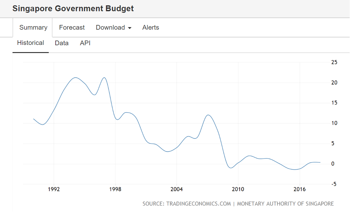 这是政府财政收入/赤字对GDP的比重。小坡在90年代存了不少钱,但是从07年金融危机开始就一直只能勉强收支平衡。总体来看,财政纪律不错,所以在可见的未来指望政府大把花钱不实际。