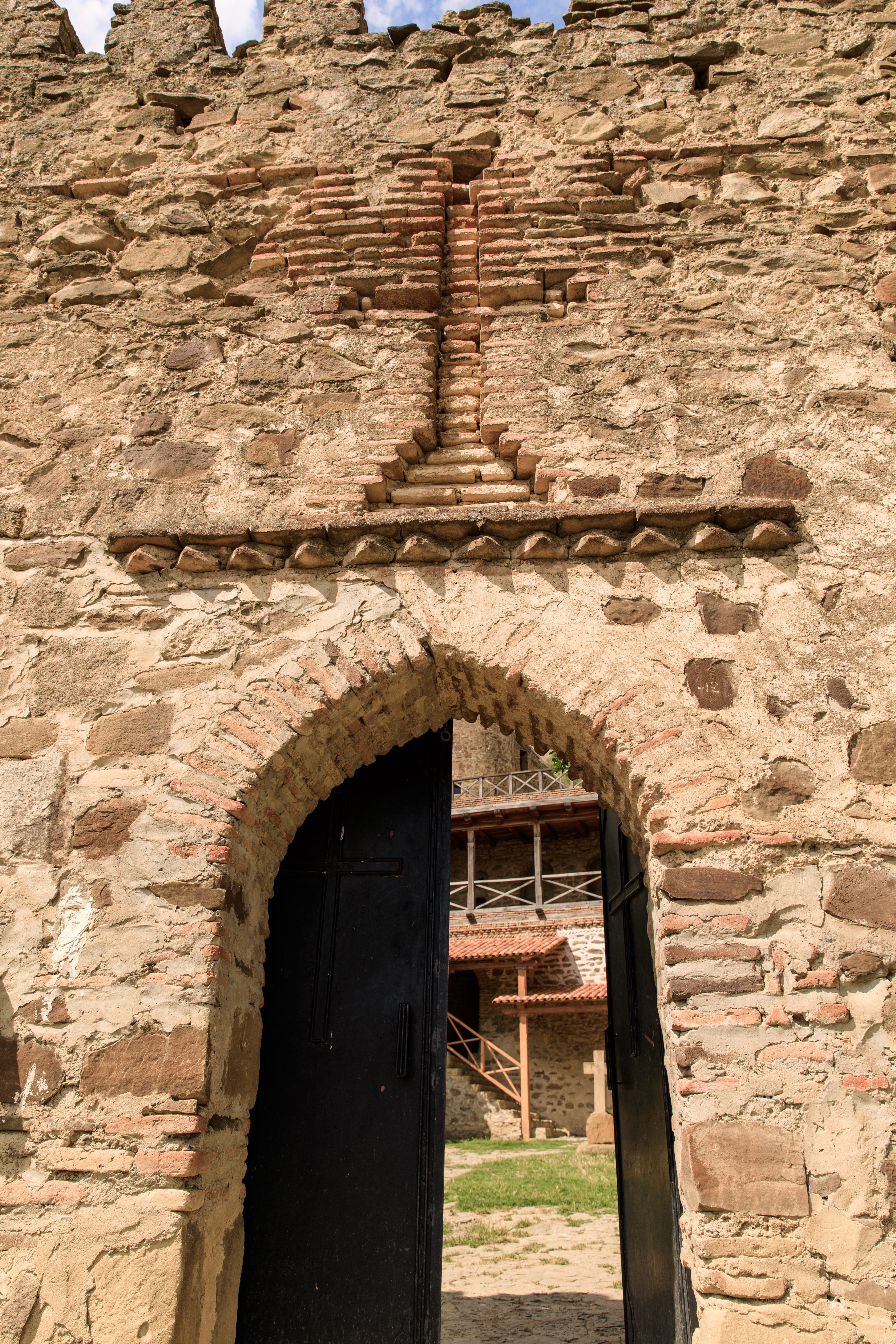 差不多两个小时开到Mount Gareja山脚下,David Gareja开放的部分大体分成山下的Lavra monastery和上面的Udabno monastery。Lavra是此地最古老的修道院,靠近停车场,从lower gate进入,有通道可以到上面的main gate。里面保留着教堂,庭院,以及一些凿进山岩间的住所(不开放)。远看的话像一个中世纪的集市(我朋友评价的),被环绕在赭色的砂岩(被我们戏称为五花肉or梅菜扣肉)之间。但实际上常年整修,大部分都在施工,可以参观的部分很少。