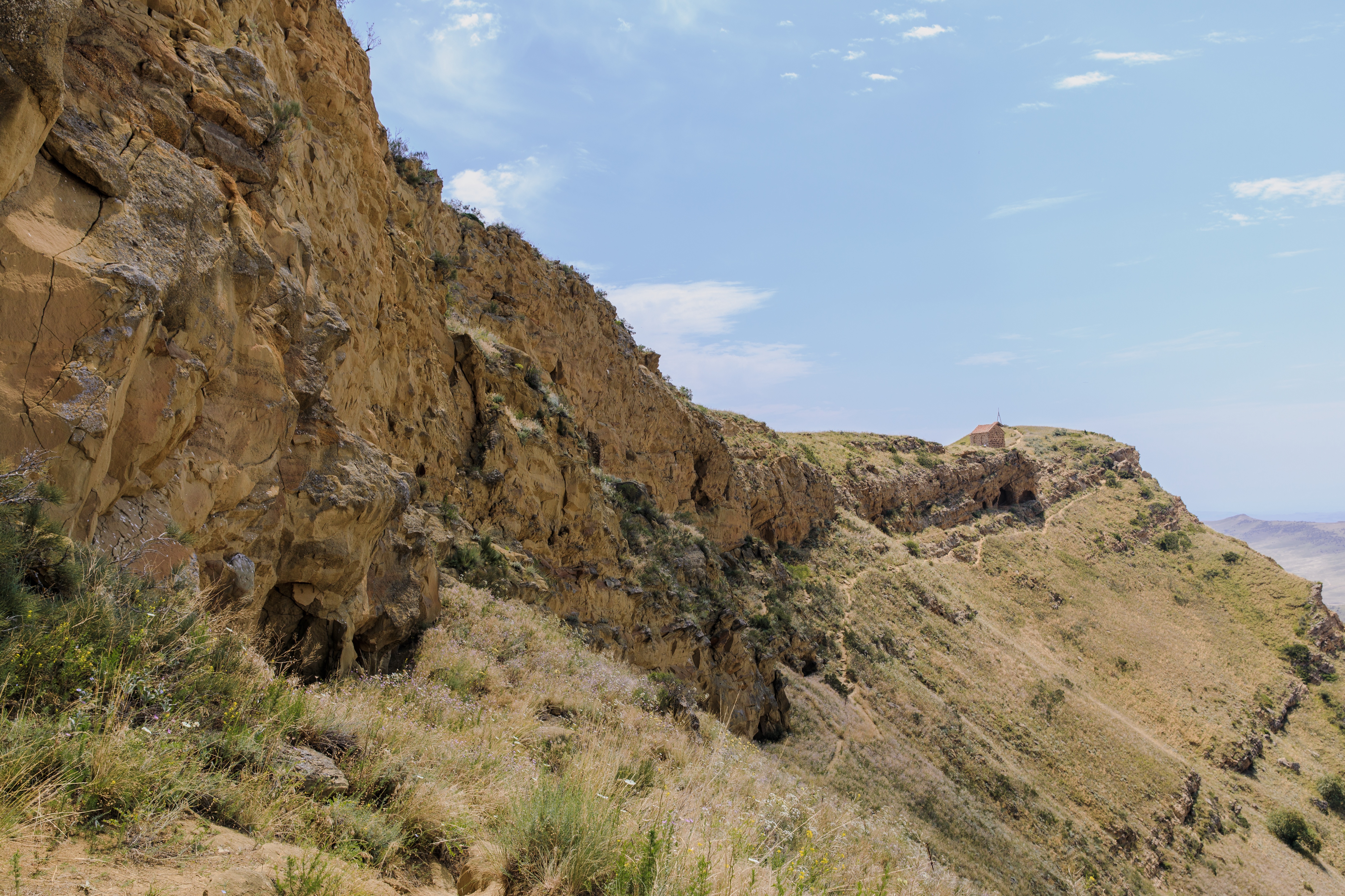 上山的路上有铁栏杆,翻过山脊到面向阿塞拜疆一侧,沿着栏杆往东南方向走一段,就可以远远的看到了Udabno的洞穴。
