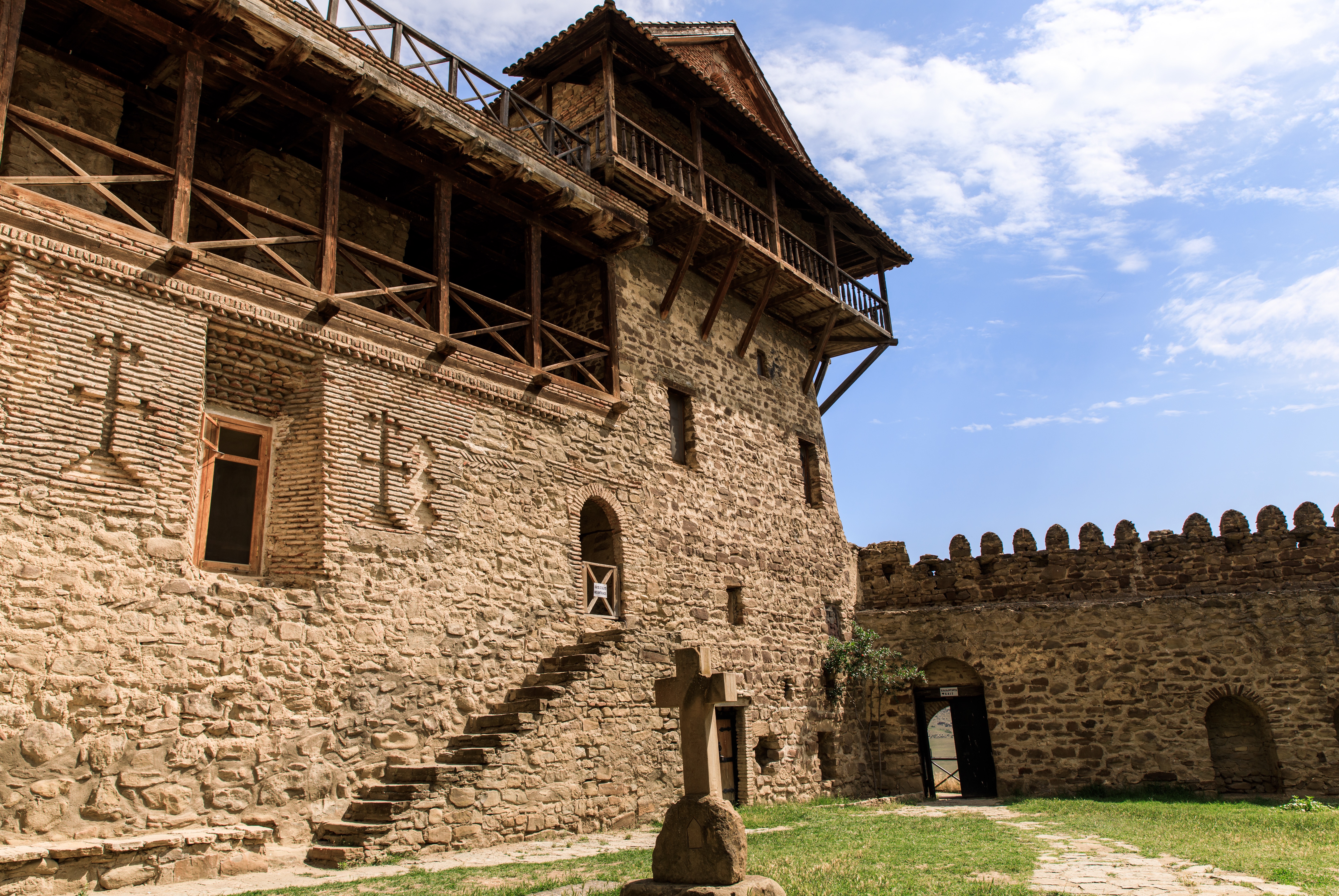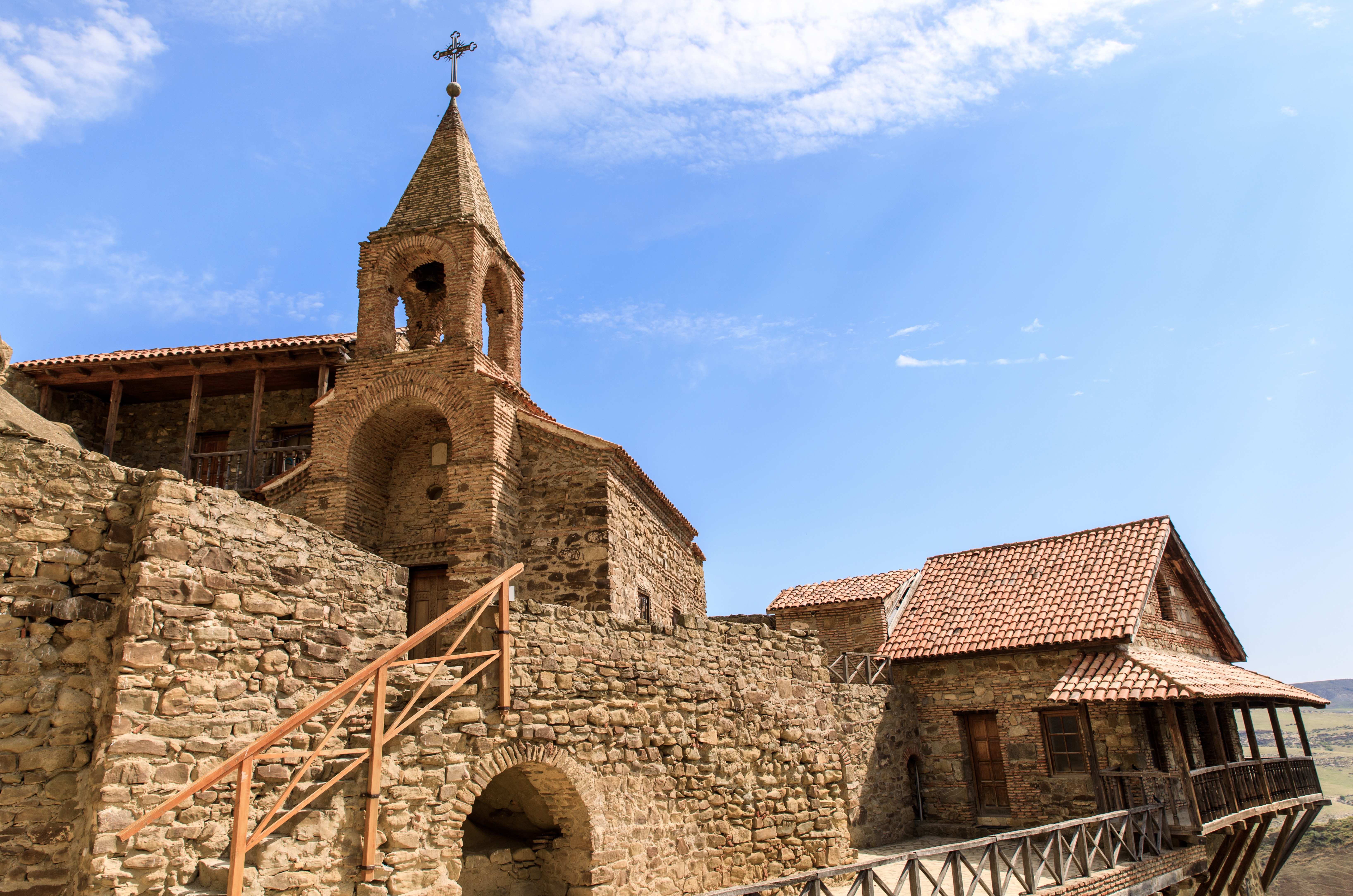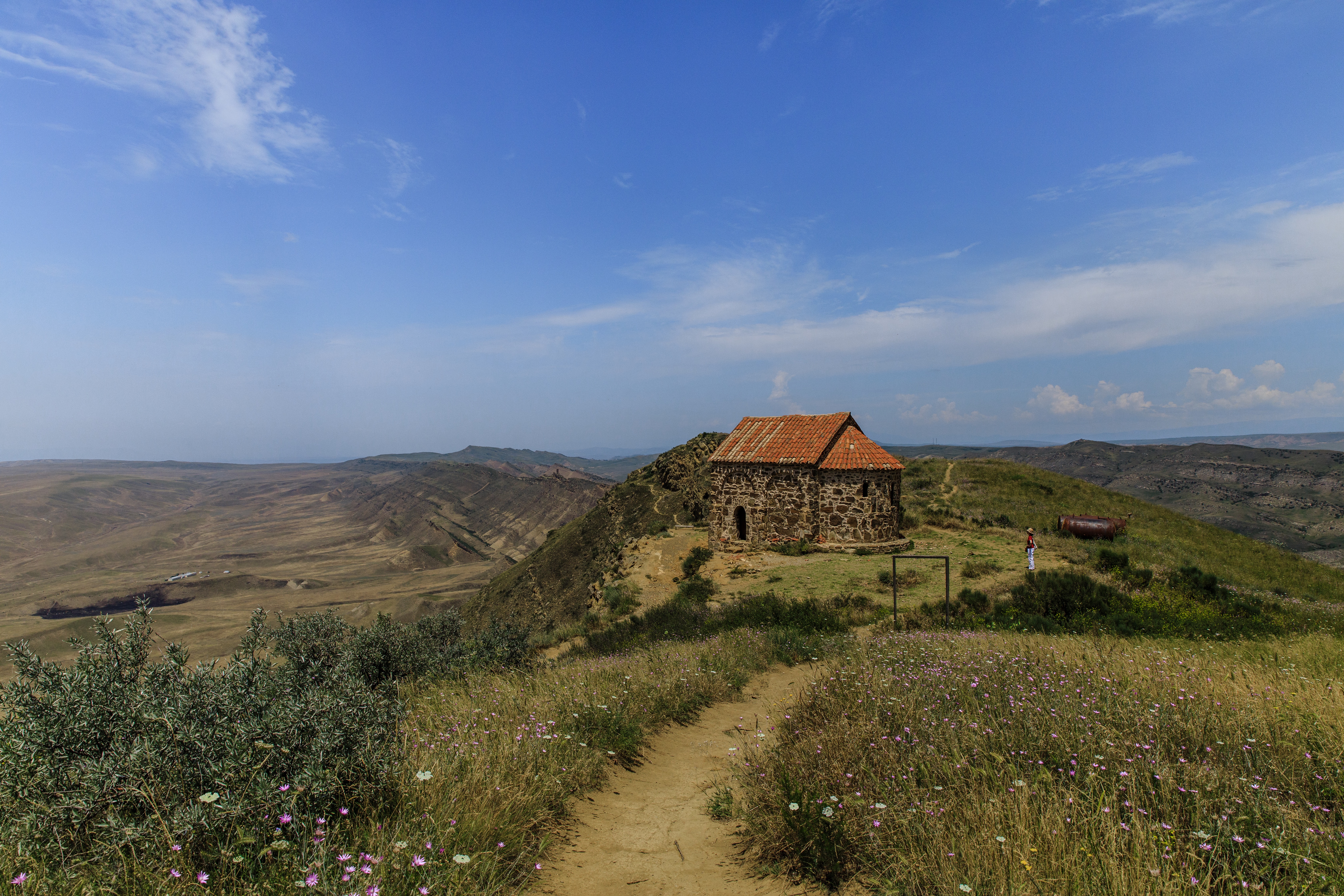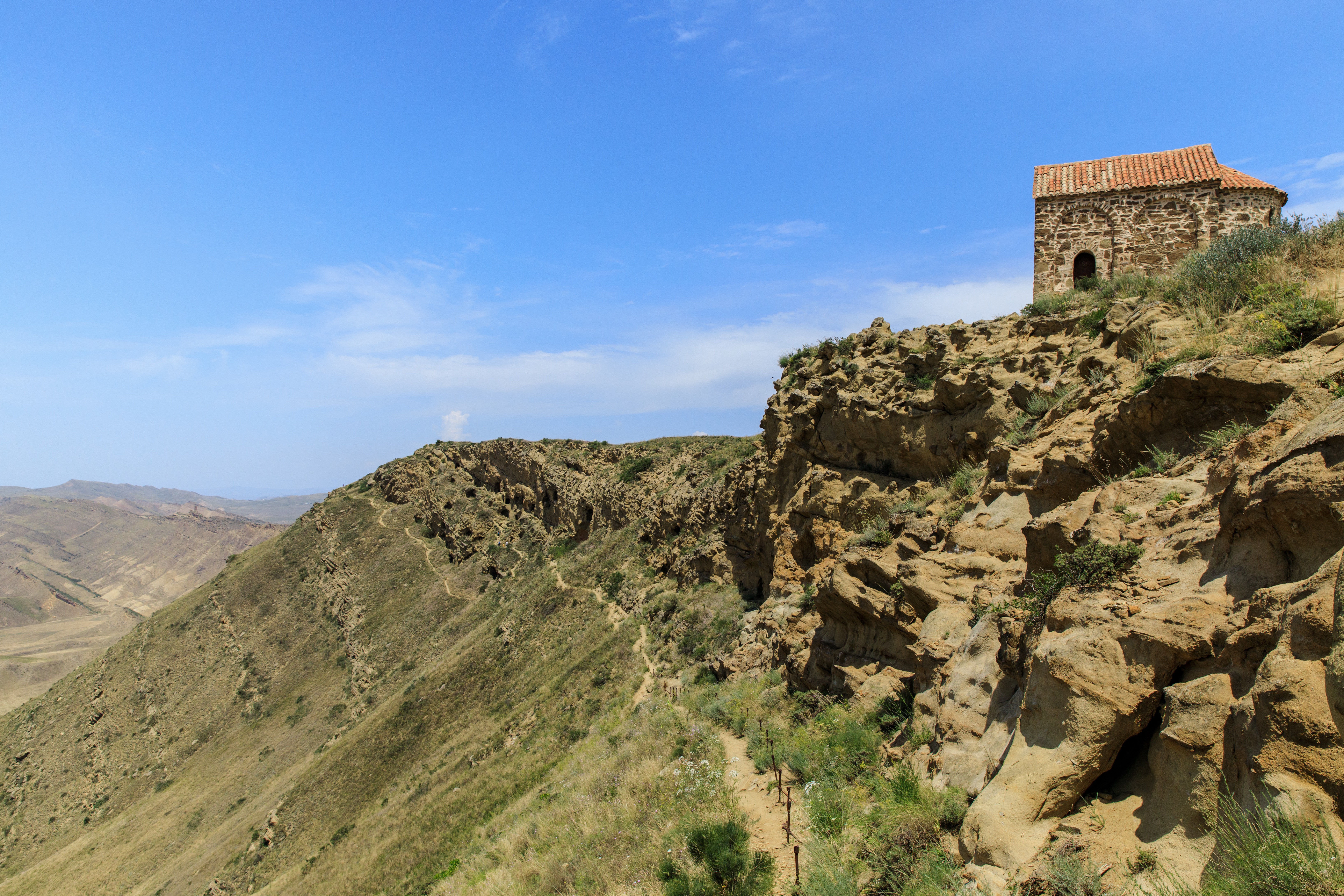 这里有意思的是,山两侧风光完全不同。格鲁吉亚是青翠草木之间显露出类丹霞地貌,阿塞拜疆是茫茫的荒漠。千百年前的僧侣们就在这样一座山上隐居,与世隔绝,艰苦的清修。