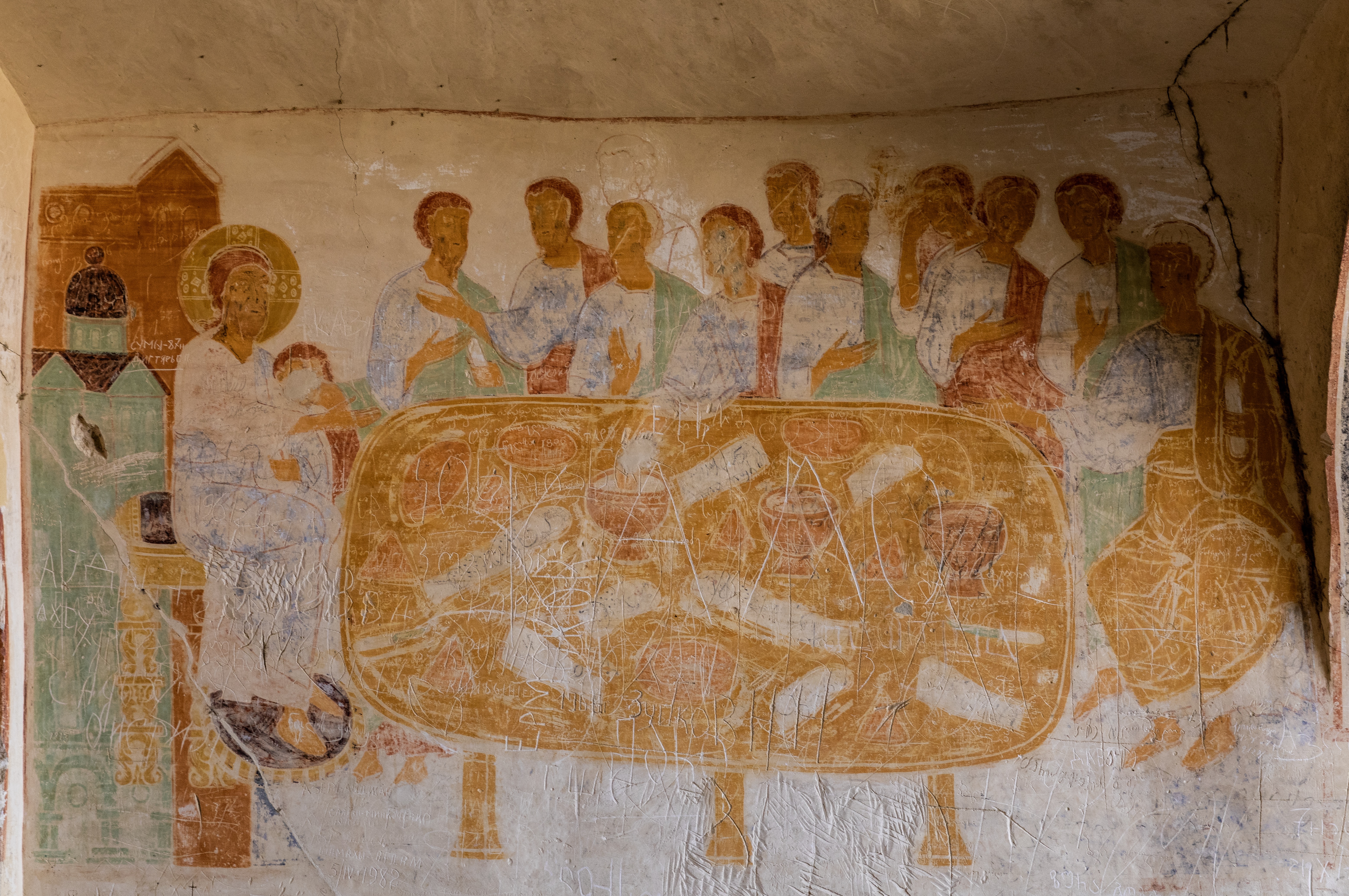 洞穴分为三层,最下面的在路边还算是好接近,中层需要攀爬上去,最上面的就……emmmmm 至少我是没看到有人爬上去。每个洞穴外面都会标志着编号,部分保留着10-13世纪之间的壁画,但损毁的非常严重。残留的几个洞穴,我们第一个进去仔细看的是36号。这里曾经是僧侣们的食堂,可以看到当时他们跪坐吃饭的石桌。侧面墙上有一张最后的晚餐的壁画。