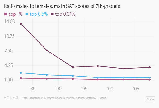 引用美国Duke大学学者的研究Researchers at Duke studied SAT scores of intellectually promising 7th graders (ages 12 to 13) over the last 30 years. The figure below took the ratio of boys to girls who scored in the top 1%, 0.5%, and 0.01% of the distribution in math scores (girls have a slight edge on the verbal SAT, but the differences are not nearly as large).