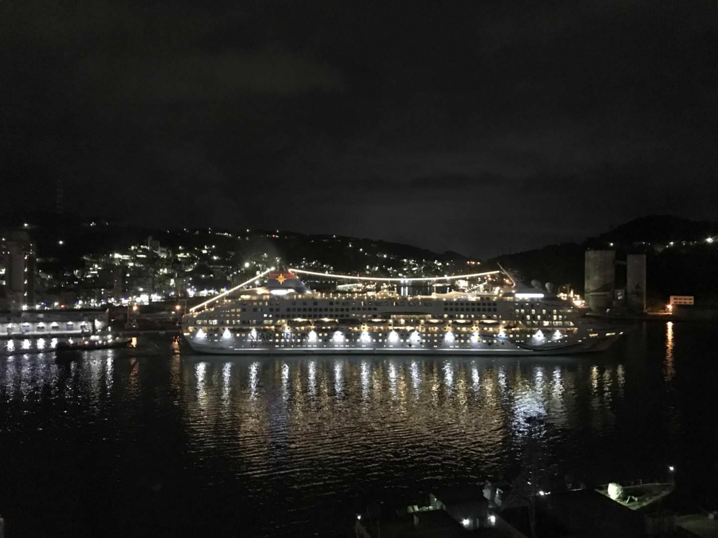 投宿基隆港。夜市归来,一瞥窗外,咦,繁星流动?却是公主号邮轮头披灯饰,缓缓出港。赶紧拿起手机拍下她的倩影。