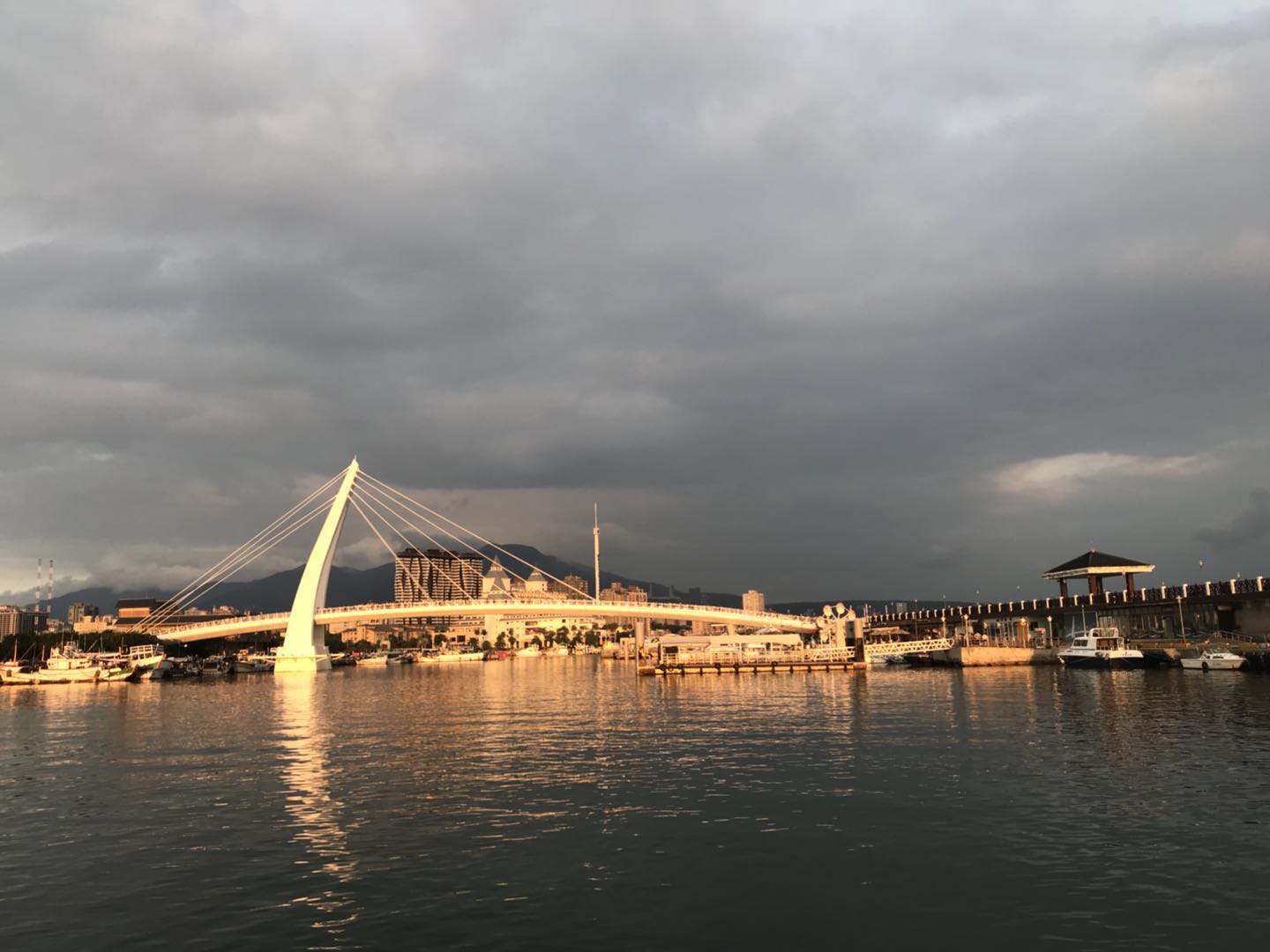 黄昏的渔人码头,一片金色。远处和对岸山峦起伏,海风轻拂。顿悟”文旅淡水吹风”的意思。
