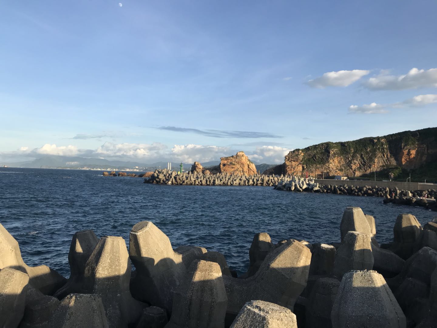 一路上右边是山,左边是海,车辆拐过一处海角,目的地野柳公园。这时的海是静谧的,浪花不翻。斜阳夕照着近处远处的巨石山头孤岛,懒洋洋的。