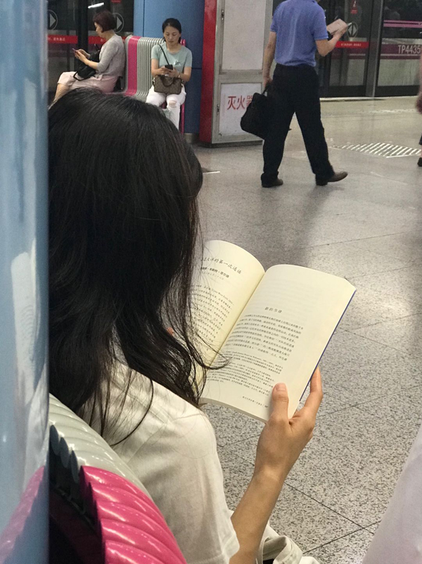 朋友们看了这些照片,有的也变成北京、南京、上海、杭州地铁读书人的记录者。当然,最使我欣慰的是有人因此而感动或自责,进而也带着书上地铁,或者在任何方便的时候翻开书来。唤起一颗又一颗热爱阅读的心,于我就是做了一件大善事了。
