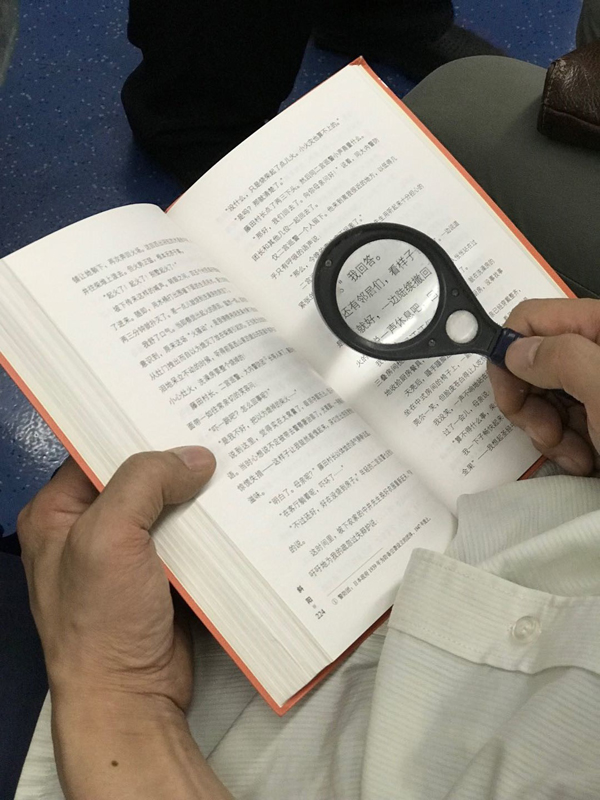 摄于2018年5月28日。当我找出各种理由不读书的时候,这位老人在地铁上拿着放大镜逐字逐逐句阅读太宰治《斜阳》。