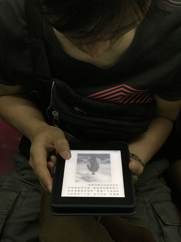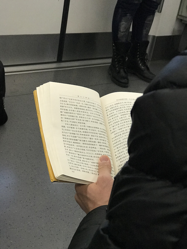 对阅读本身来说,除了读书的人,最值得关注的当然是书。而那些被带上地铁的书,也为我打开了一张书籍图谱。简体中文版自不必说,读竖版古籍和繁体台版者有,读外文书的外国人和读外文书的中国人有。读页面泛黄的旧书者有,读不足巴掌大的袖珍书者也有。给纸书包书皮的不分老少,给kindle套书衣的也不分男女——他们每一次打开书开始阅读时,心情都会很好吧。