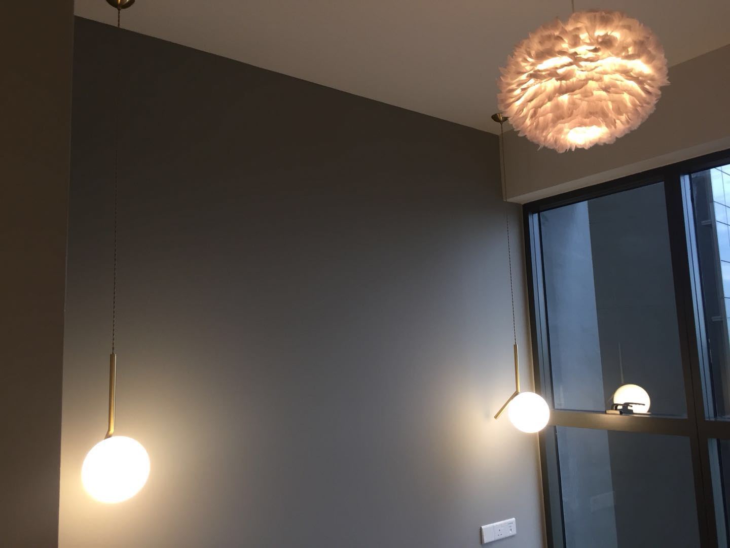 我找到刚刷漆以后的一张图,可以说明gray dew到底是什么灰色,另外,我的深灰叫dinosaur gray。卧室的两个球形吊灯是这次淘宝的灯中我最最喜欢的,海德公园的小号黄铜吊灯,质感简直了,价格当然也是不那么可爱。羽毛灯vita家的大家都知道,是淘宝上找的代购,好看是好看,就是亮度很一般。我也顺便推荐我找的射灯和灯带淘宝店家:仙人掌先生。
