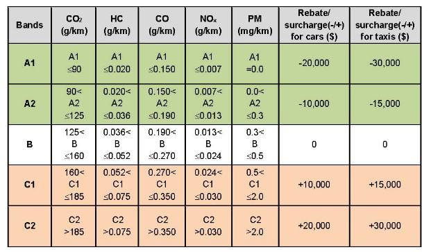 车辆所享有的VES回扣或附加费共分五个等级,当局将根据表现****最差****的污染物决定回扣额或附加费。例如某车款若有四种污染物质都属表现最好的A1等级,但有一种污染物质被列入最差的C2等级,它将无法享有回扣,还得支付最高2万元附加费。