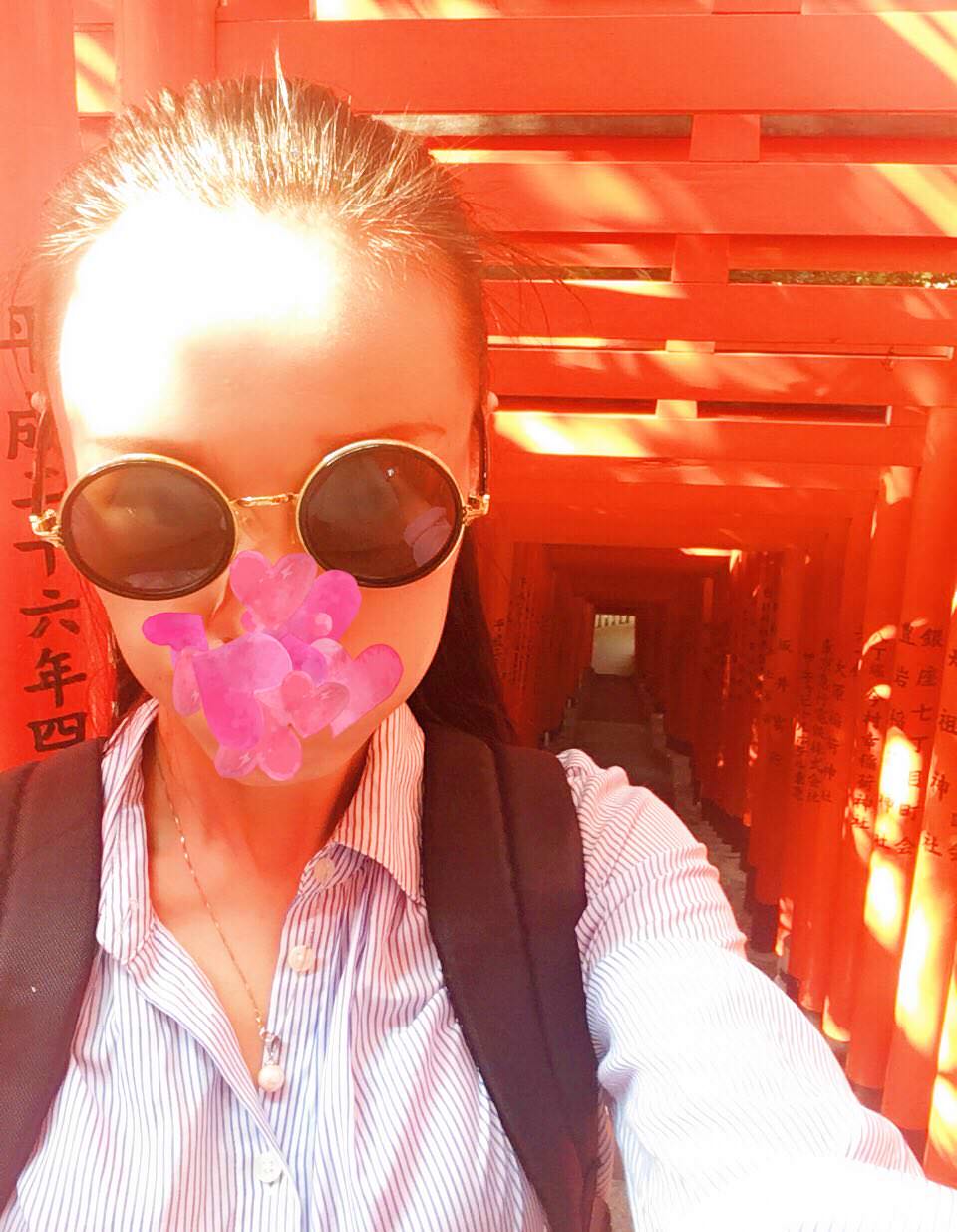 哈哈哈笑哭了( ̄▽ ̄)~~自己玩也没啥照片,唯一一张自拍就是酱。。。# 假装回到伏见稻荷+_+看资生堂还资助了一根柱子,有这闲钱还不如资助我的脸:)