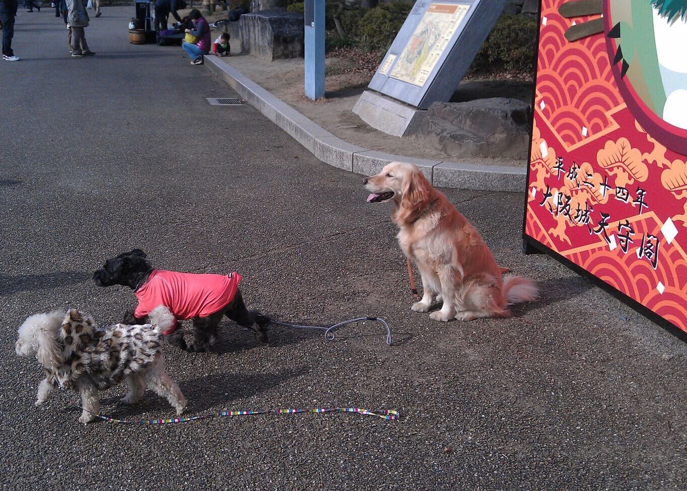 看起来好有爱~!!~~~~可以拿之前去大阪城时的照片嘛,三只狗狗并肩拍合影,虽然还没等我拿出手机俩汪星人就已经暴走了╮( ̄▽ ̄"")╭