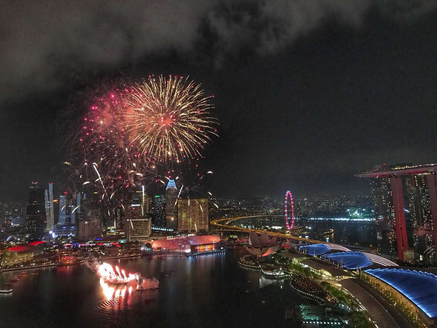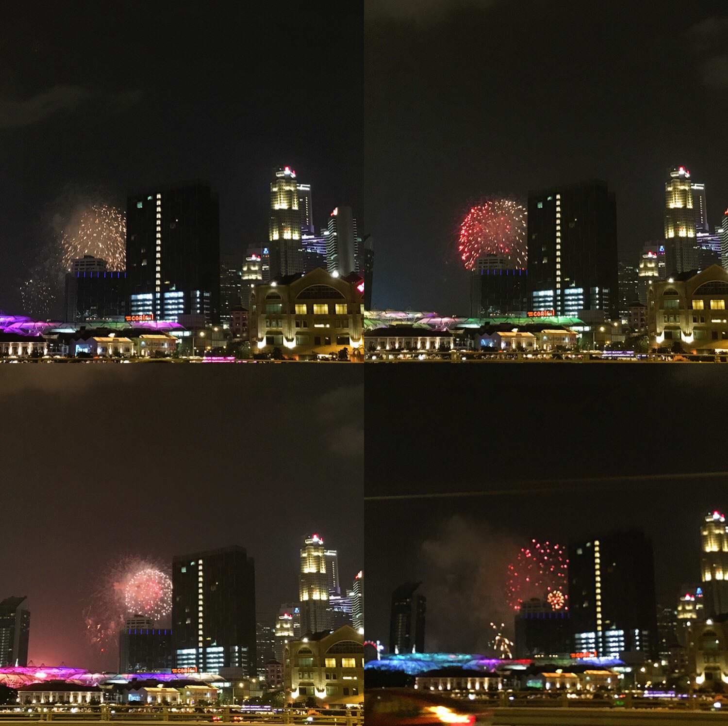 刚看完回来raffles place靠近MBFC这一带都能看到,很多车临时停靠在路边打双闪专门看烟火的