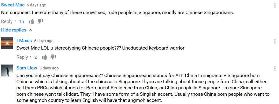 这个视频,里面明显是个装腔作势的新加坡人在发飙。这个叫sam liew 的新假坡人在品论里,又怪到中国人头上了。说是有白人口音的会是中国人。這么要黑中国人,简直把人笑死了。