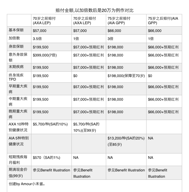您好,我是AXA的保险经纪。我刚刚去comparefirst帮您做了下两个产品的对比。因为拿不到AIA的general provision。我只将产品说明部分保障做基本对比。如果有AIA GPP部分哪里不全的地方,欢迎各家经纪补充更正,很乐意学习市场上好的plan。以加倍数后是20万为例,所有保障是或的关系,赔付多个保障时都会减去之前赔付部分保额。