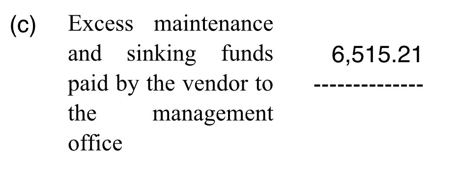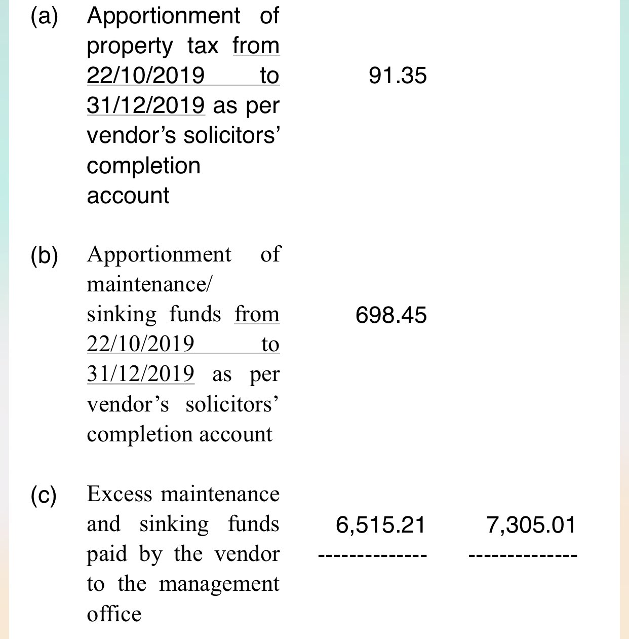 $698.45 是合理的,每个交易都是一样的。C) $6515.21 这个数额非常少见。这个要律师提供证明来看是怎么得来的,我个人估计是前业主由于疏忽多交了1年半的物业管理费。