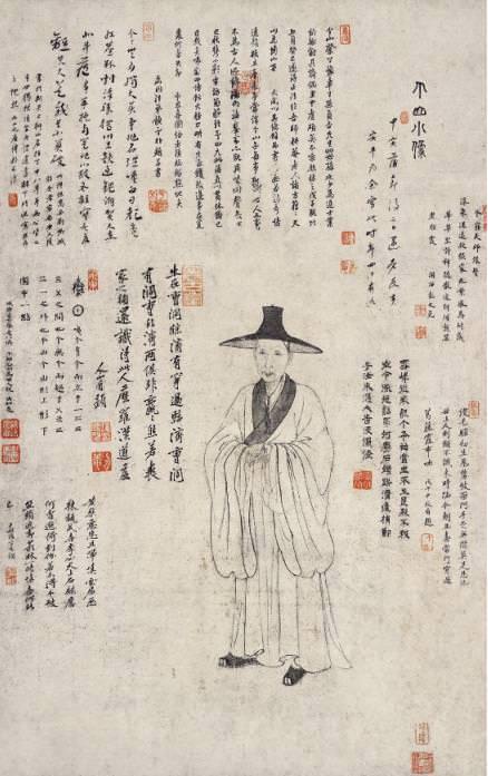 个山小像图轴为水墨人物画像,画面中下部绘八大山人全身立像,山人立像两边及上部空白之处有八大山人法弟饶宇朴、好友彭文亮和减馀居士蔡受所题三段跋文,八大山人自题六段跋文,总共有九段跋文。