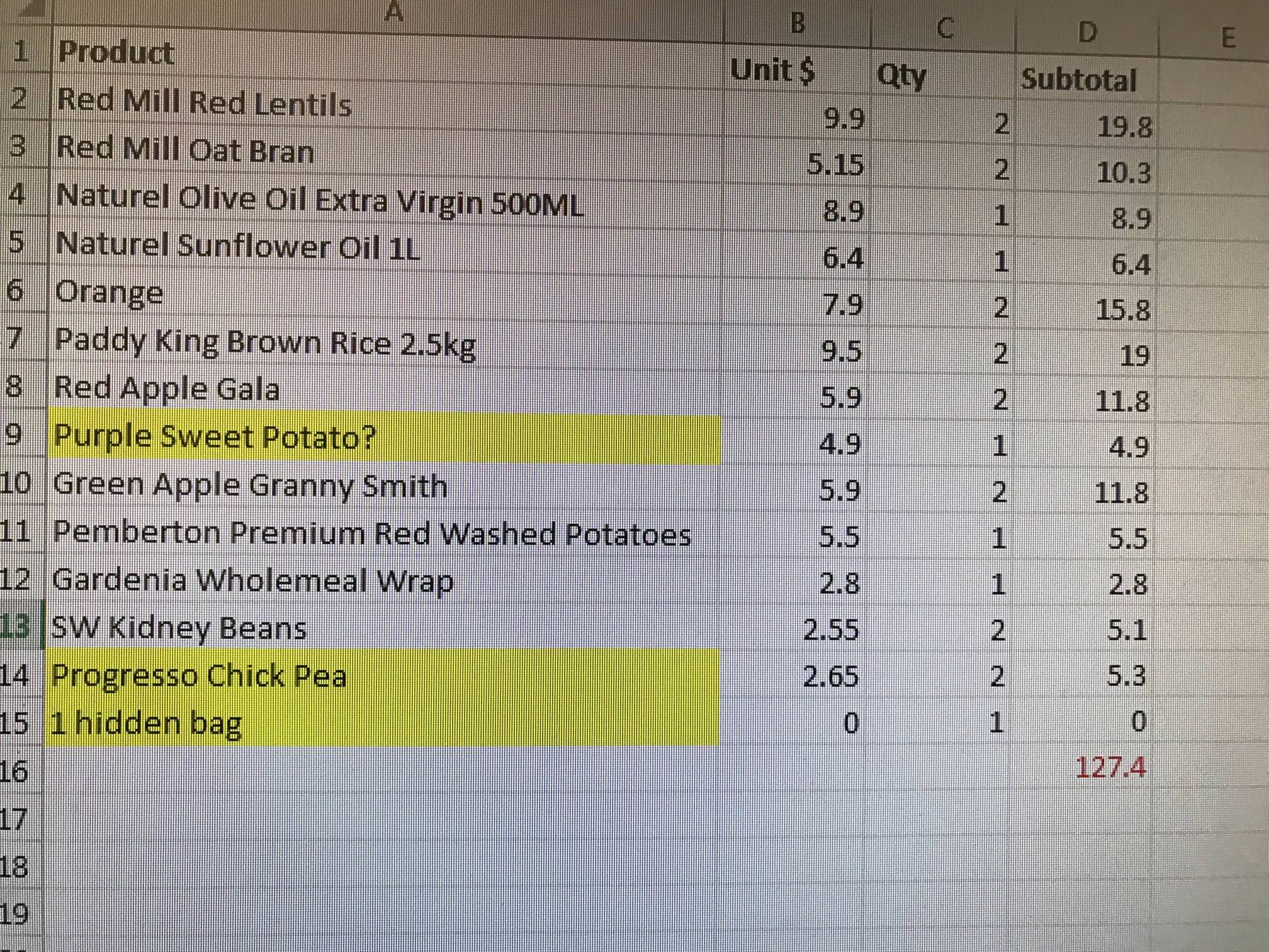 已经很接近了哇~~都贵在蔬果上去了,右下角的罐头经常买来炖肉吃。。。