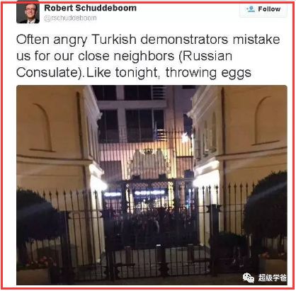 这下把战斗民族给惹毛了,当地的群众把土耳其驻俄罗斯使馆给砸了,一块玻璃都没留下。土耳其人一看不干了,于是去砸俄罗斯的使馆,结果由于国旗太像,把荷兰使馆砸了。