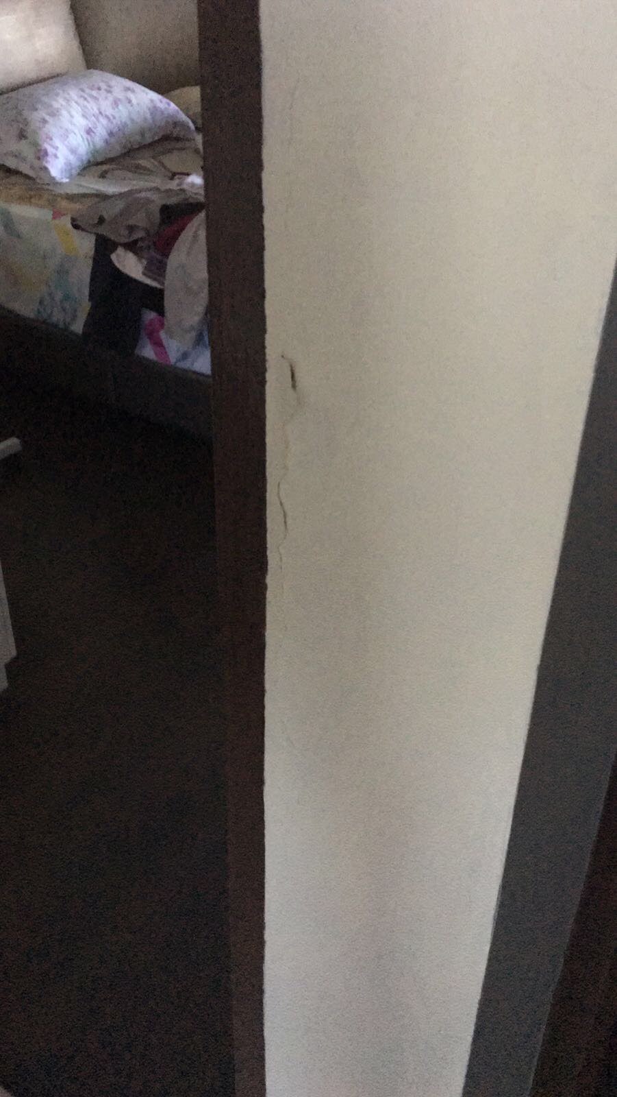 炎热夏雨 • • 41227 次浏览如题。昨天大风把房间门吹关上了,后来就发现门框周围的墙有裂纹,有一块更是被振脱了!如图。