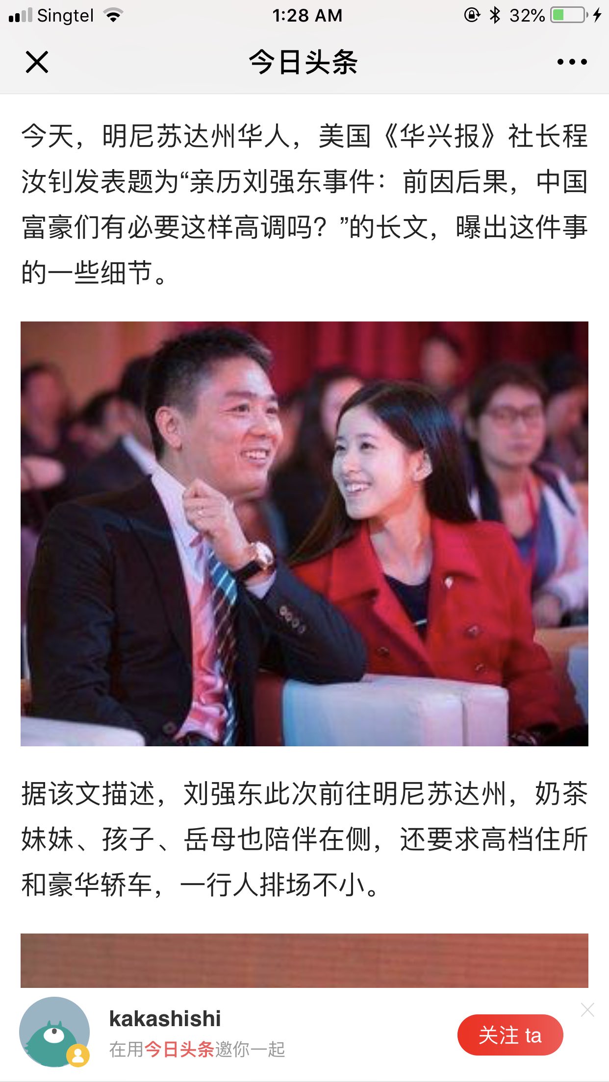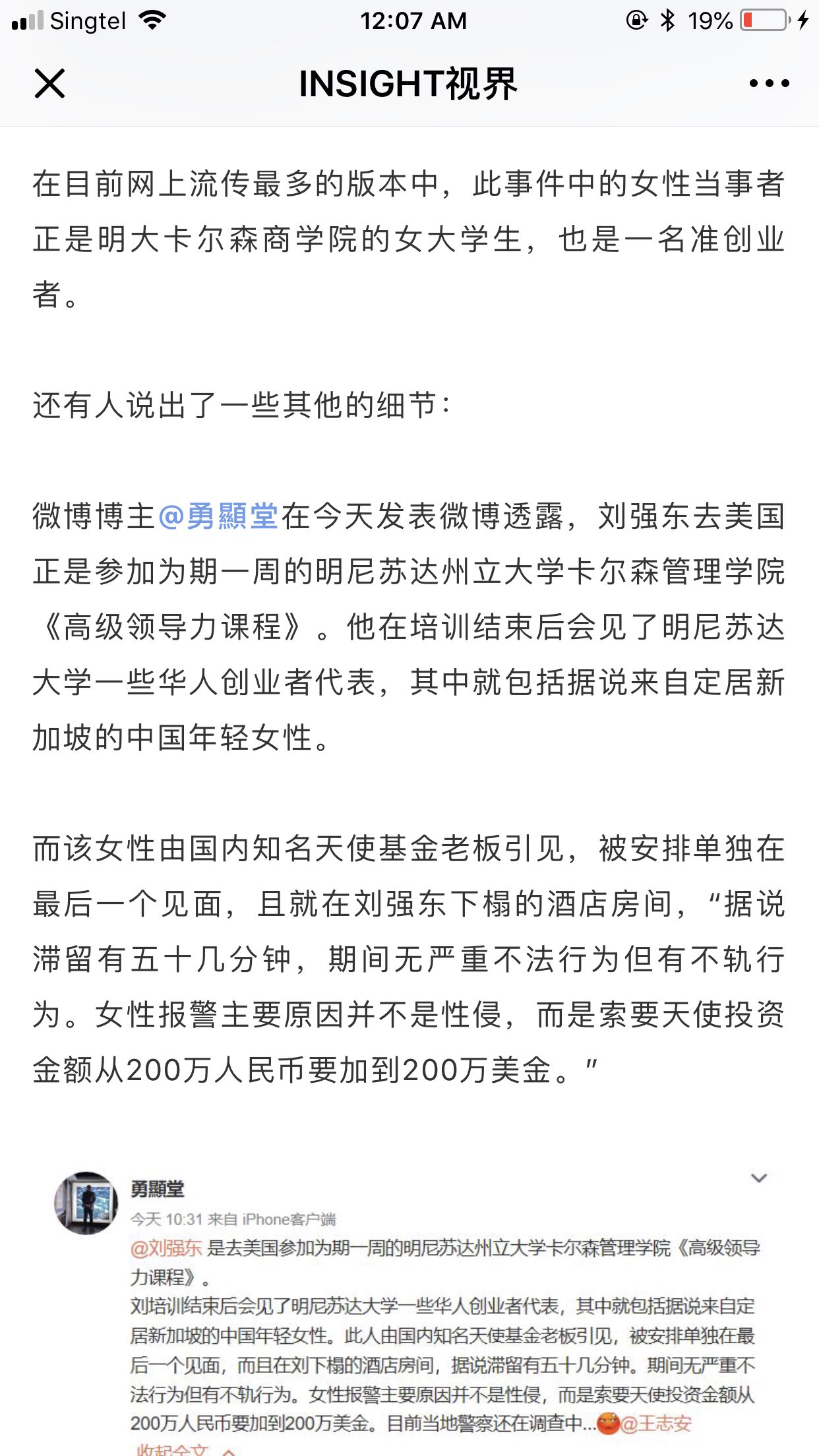 不信看《水浒传》里面,有钱有势的人好色起来,能干出什么事情,施耐庵都明明白白地写出来了:(一)县里的无赖觊觎潘金莲的美色,顶多来几句“好一块羊肉,倒落在狗口里”,西门大官人就不一样,仗着自己有钱有势,就敢采取实际行动,直接睡了金莲。武大郎发现了?直接砒霜毒死,反正阳谷县西门大官人说了算。(二)林冲娘子的美貌,一般的无赖也就心里意淫一番,高衙内仗着自己有钱有势,就敢在白虎节堂设局,后面又是野猪林谋杀未遂又是火烧草料场……按照某些知乎众的说法,这是不可能的事情啊,西门大官人辣么有钱,家里娇妻美妾多了去了,怎么可能为了一个卖炊饼的老婆去杀人呢?至于高衙内,更是不可能的,高大公子会是缺女人的那种人吗?除了家里的美貌妻妾,京东,阿不,是大宋的东京,还有辣么多的花街柳巷,肯定是林冲娘子碰瓷嘛!第三点,我说点新发现,刘强东和性侵案扯上关系已经不是第一次了。2015年悉尼的豪宅派对就已经爆出了性侵案,请看纽约时报今年7月的报导:这次莫非是南半球的女性玩得不过瘾,玩到北半球的女性来了,南北女性的两个半球现在你玩得过瘾了吧?啧啧 刘强东还是个惯犯啊。这次性侵的女孩是留学生,绿茶妹妹也是一个留学生,莫非好这口呢?就像煤老板喜欢女大学生一样,哎呀呀……接下来进入私货时间!实话实说,我早就看刘强东和绿茶妹妹不顺眼了!为何?我就是最看不起消费人设,尤其是消费亲情的行为,至于买通稿霸占我微博微信,更是深恶痛绝。这么说吧,我微博上第二烦是贾乃亮,第一就是你们俩口子啊!