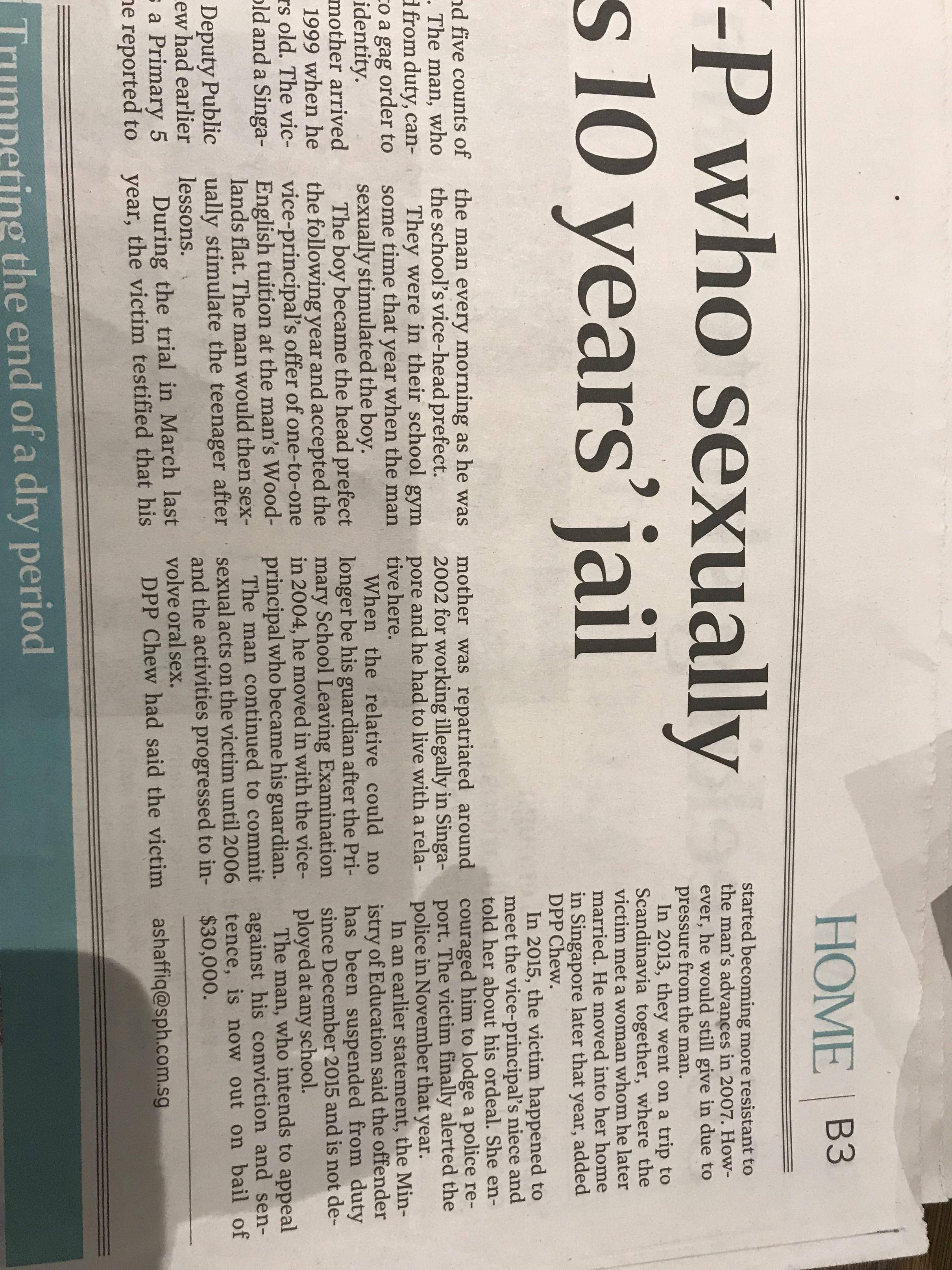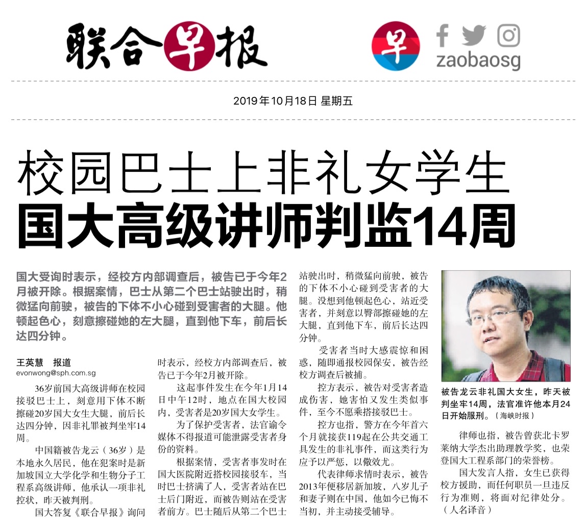 也不是谁都曝光前两天straitstimes上有个本地副校长猥亵中国来的男童多年,直到男童长大交了女友才举报这个校长。然后报纸说不披露校长的名字因为有个gag order. 我很好奇是这次龙云的律师不给力还是咋地?为啥这次没有gag order?