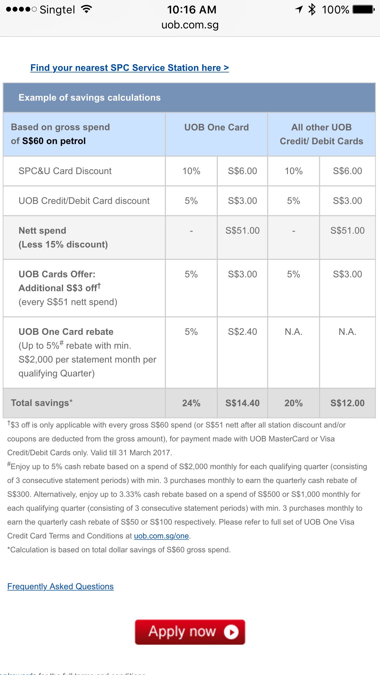 那的确有点吸引力啊。UOB 的哪张卡?50元以内的优惠是多少?比如 SPC + POSB Everyday = SPC 15% discount + POSB Everyday 6% Rebate。