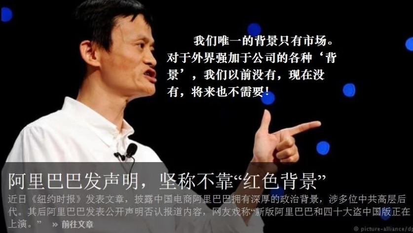 2014年纽约时报把阿里巴巴扒拉扒拉,结果扒出来的内幕足够吓死人了:阿里巴巴融资时,在投资阿里巴巴的四家中国企业的高管中,居然有2002年以后在中央政治局常务委员会任职的20多人的子孙。博裕资本江志成是江泽民的孙子,国开金融贺锦雷是前政治局常委贺国强的儿子,中信资本刘乐飞是当朝常委刘云山的儿子,中信资本曾之杰是前副总理曾炎培的儿子,中信21世纪王军是王震之子…乖乖咙个咚,看了这个才知道啥叫真正的拼爹啊!阿里巴巴此次在美国上市后,估值将超过2000亿美元。没想到背后有这么多的“阿里爸爸”,这不能不令人联想到马云的阿里巴巴可能就是这些“阿里爸爸”的洗钱渠道,那么牛逼冲天的马云先生就是这些红色后代“爸爸”们洗钱的小白手套了。当然了,马云暂时是死活不会承认的。