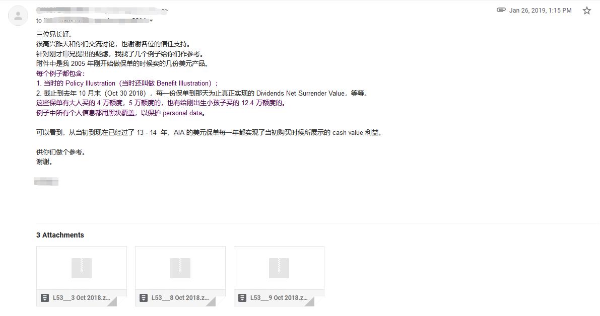 新加坡也经常有客户针对 non guaranteed 部分进行询问,我曾找出 05 年刚入行时卖的几个真实例子来说明新加坡 AIA 的美元产品迄今都是 “所见即所得”,email 截屏如下(如果楼主想看例子中的具体数字,我也可以贴出来):