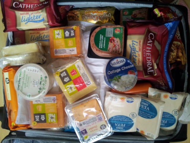 自己大学时期就迷上这口,导致一不小心就月光或半月光;老公更是cheese狂魔,普通的一块(200g左右)拿来当零食最多两次就干掉了。。放个真相图,当时去英国回来基本没背护肤化妆品,一整个箱子全给cheese了。。。