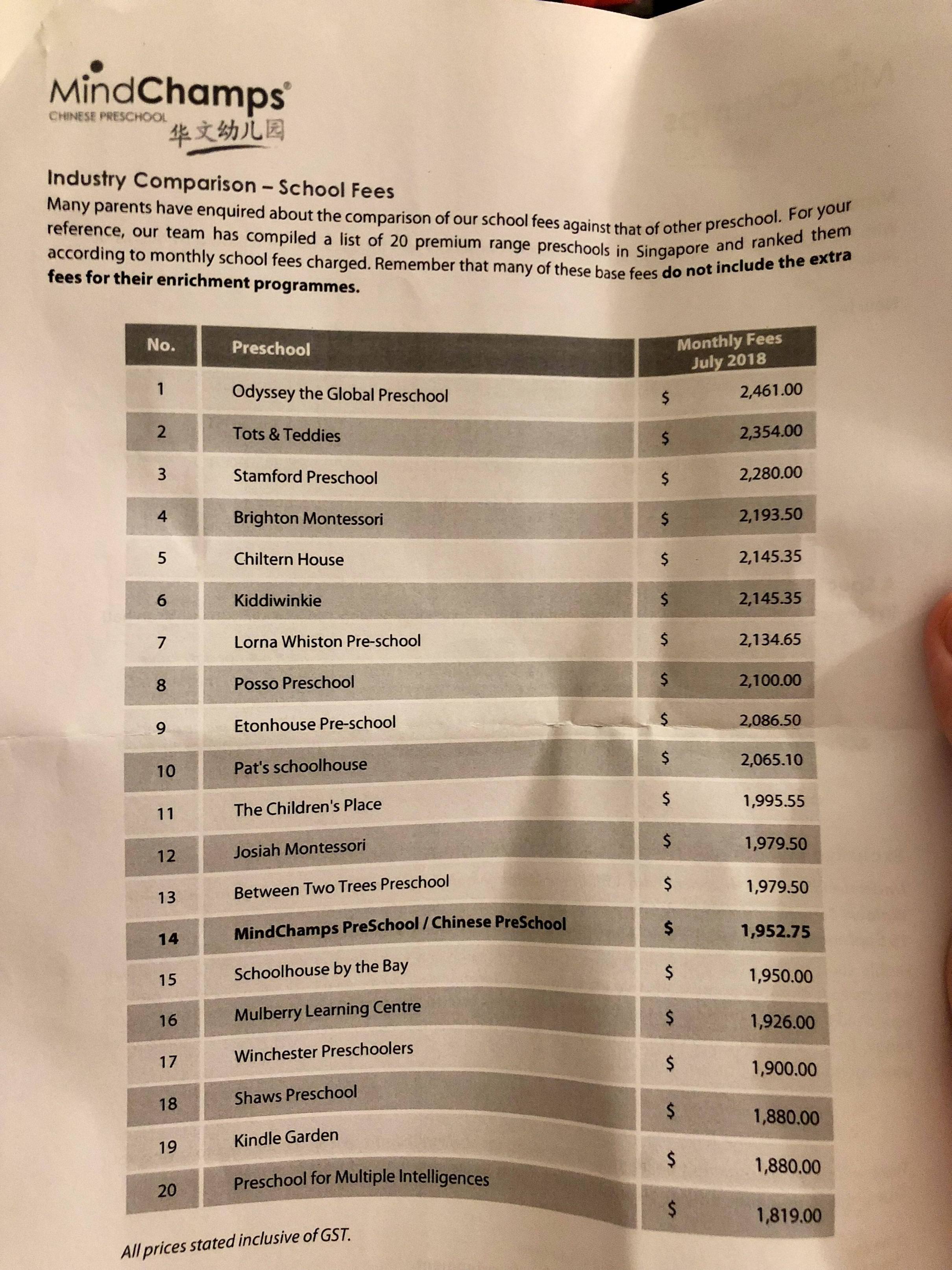 两万美金也无非就是2200新币/月左右 这张图上好几个幼儿园都比那个贵了