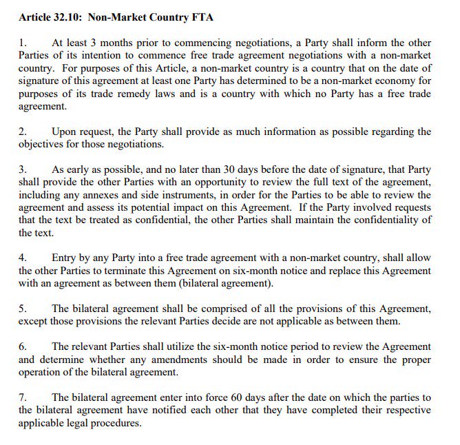新美墨加USMCA协议有一条规定:任意一方在和非市场经济国家签订自贸协定时都必须通知另外两个成员国。另外两国如果认为贸易伙伴新签订的自贸协定影响本国利益,可以在六个月内以退出USMCA作为反制措施。
