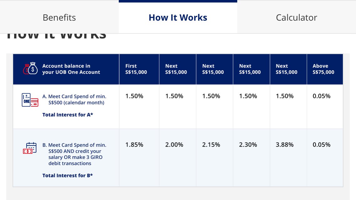 简单的说你要开一个UOB ONE saving account和一个UOB ONE信用卡。saving account存入7万5新币,设置三个GIRO用储蓄户头还钱并且按照calendar month每个月刷够500信用卡消费,这样你的储蓄户头就有高利息了。