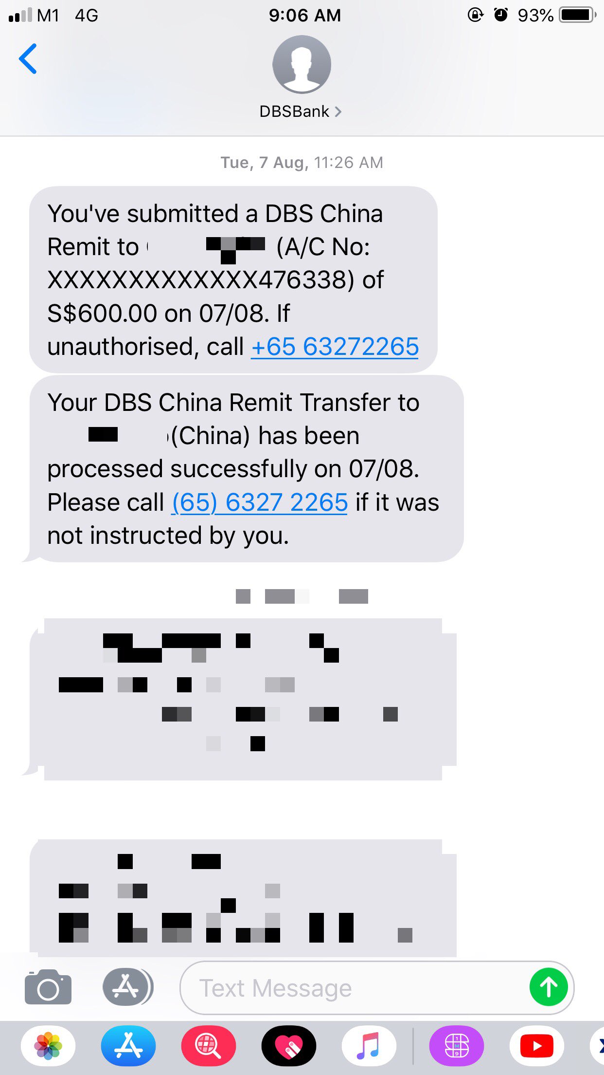前俩月听说DBS的很快然后就试了一下大概一分钟就到账了,不过我是转给自己的国内账户。一般来说当天到账就是正常的吧,到账了你会收到短信提示。