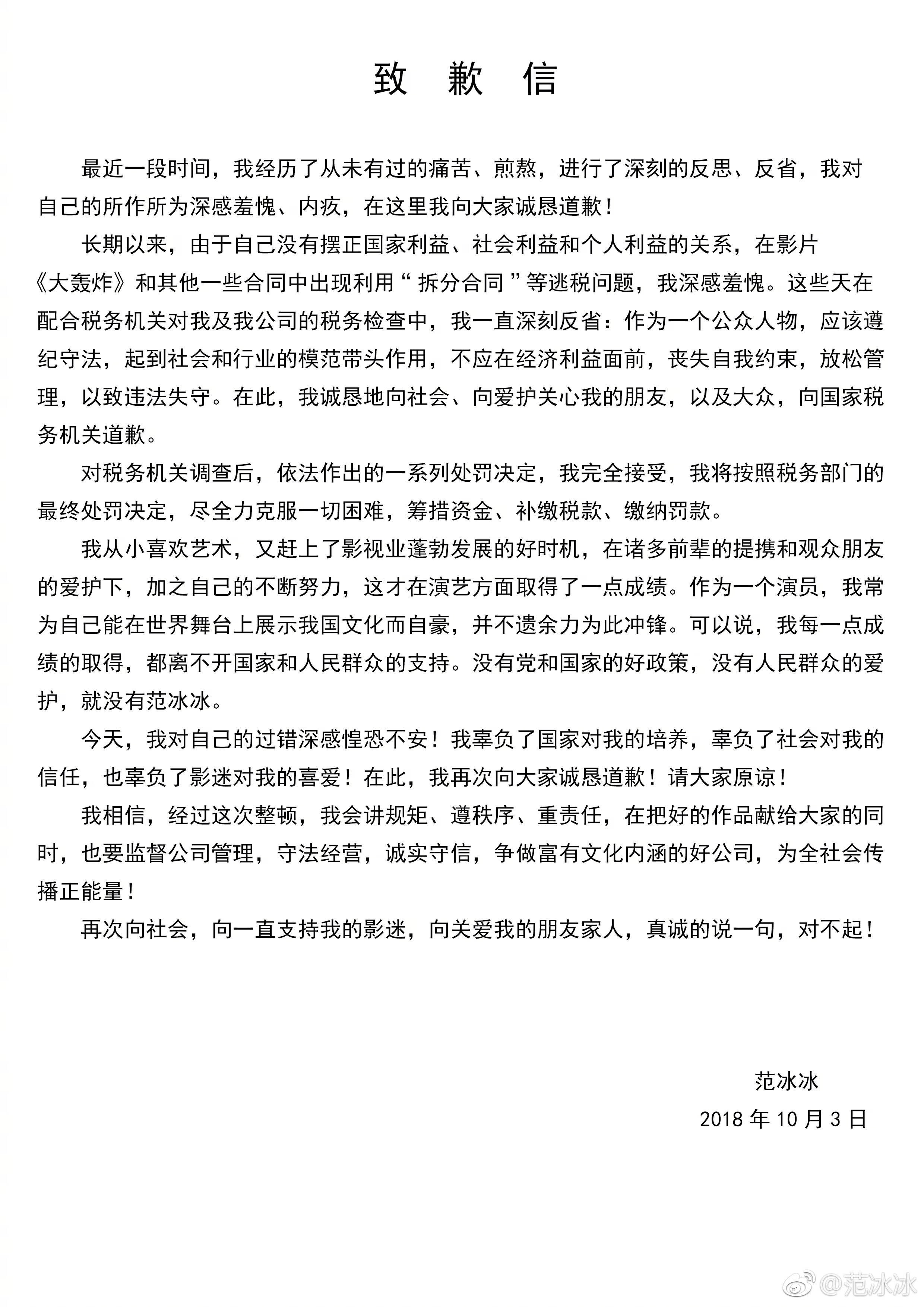 范冰冰被罚共计8.8亿人民币依据《中华人民共和国刑法》第二百零一条的规定,由于范冰冰属于首次被税务机关按偷税予以行政处罚且此前未因逃避缴纳税款受过刑事处罚,上述定性为偷税的税款、滞纳金、罚款在税务机关下达追缴通知后在规定期限内缴纳的,依法不予追究刑事责任。超过规定期限不缴纳税款和滞纳金、不接受行政处罚的,税务机关将依法移送公安机关处理。