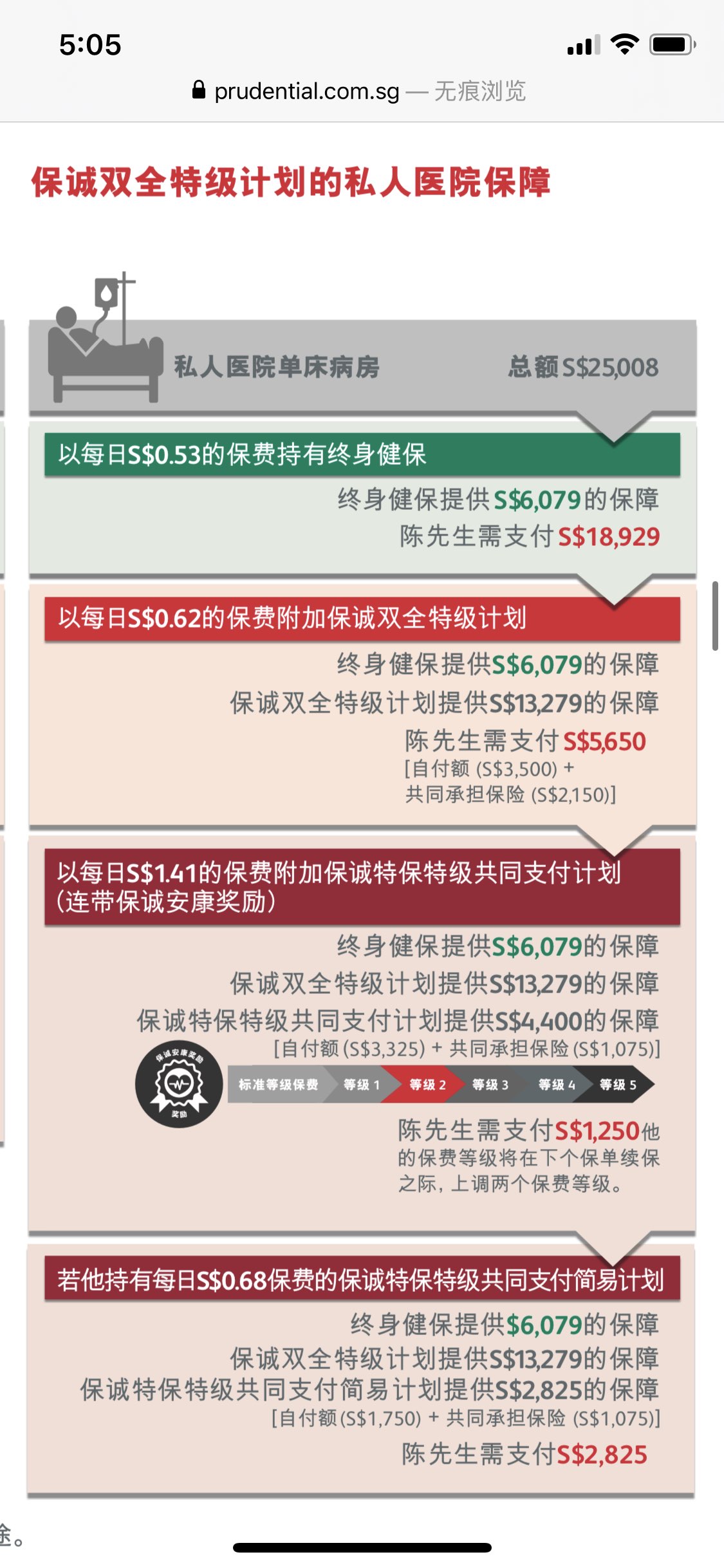 顺便借帖提一下Pru的Lite 附加险私人医院保单的Lite Rider(简化版),任何私立医院/医生,自负额$1750,但是保单Rider每年的价格就$200+。