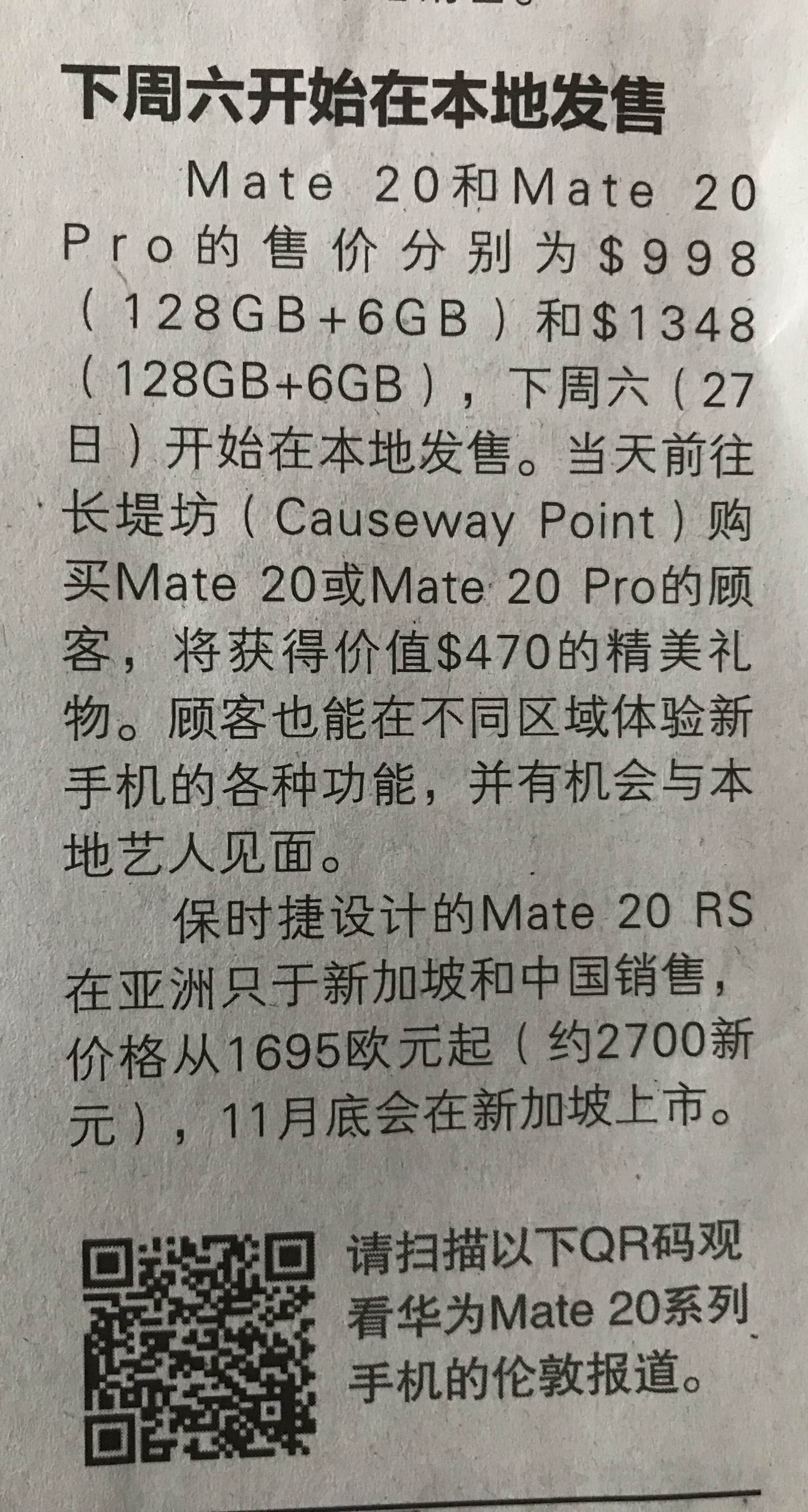 下周六开始新加坡发售mate20和mate20pro,$998和$1348