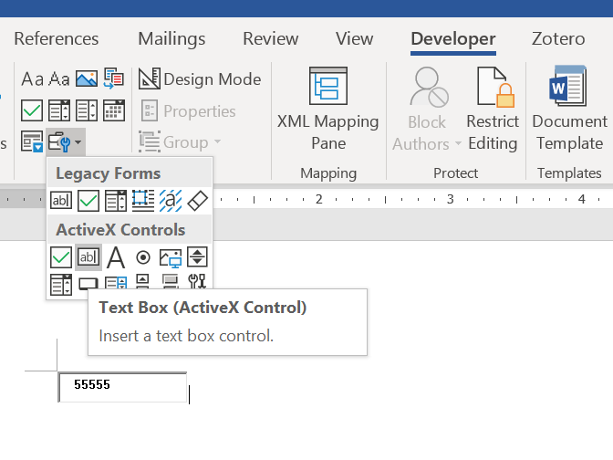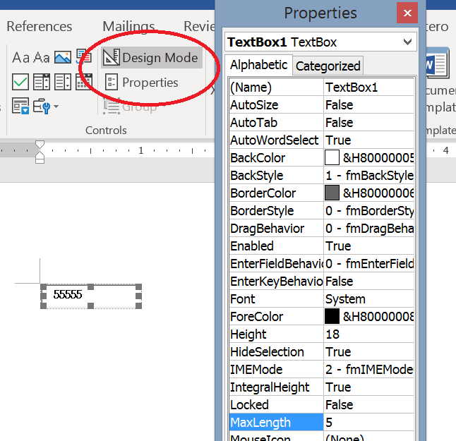 选中你要的text box,ribbon上把Design Mode选亮开启设置模式(见下图,开启的时候Design Mode字样背景变色,text box四周出现可以用来拉大小的方块块),再点Design Mode下面的Properties,会出现一个狂长的属性列表,把其中的MaxLength改成你要的最大字符数就可以了。(MaxLength默认值=0,表示字符数不限)