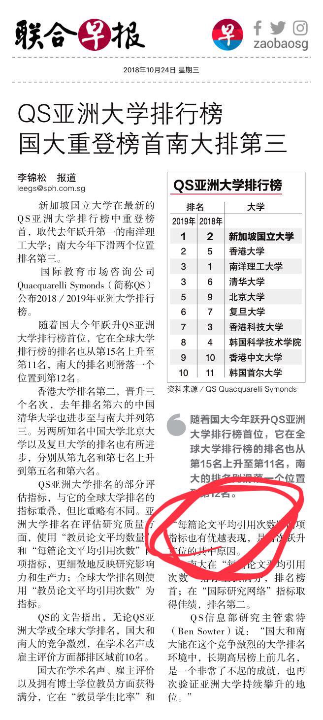 不理你可以吗? • • 26806 次浏览新加坡国立大学在最新的QS亚洲大学排行榜中重登榜首,取代去年跃升第一的南洋理工大学;南大今年下滑两个位置排名第三。